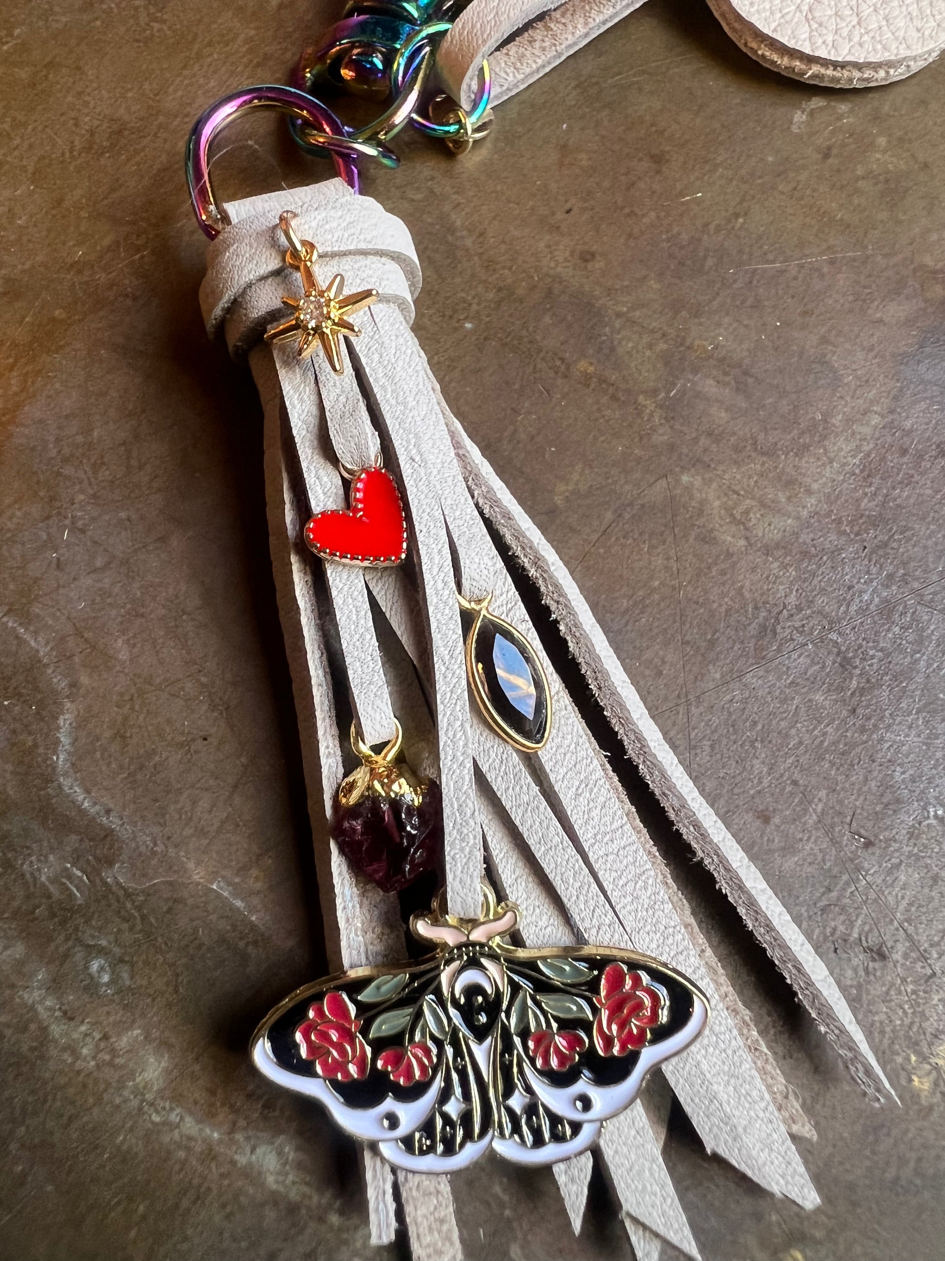 5" salt leather on iridescent hardware, includes keyring (not pictured.)