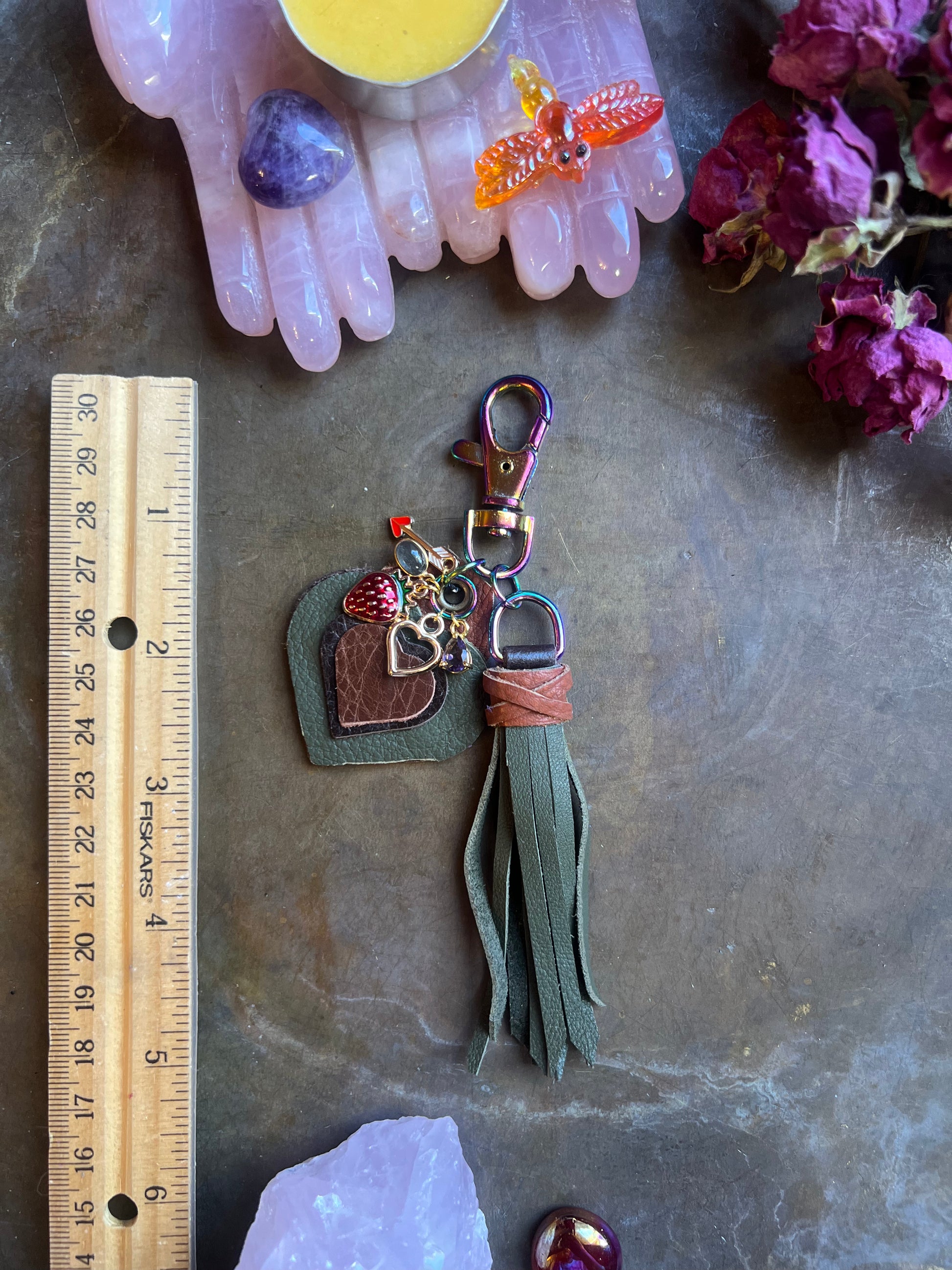 5" army green with brown accent leathers on iridescent hardware, includes keyring (not pictured.)