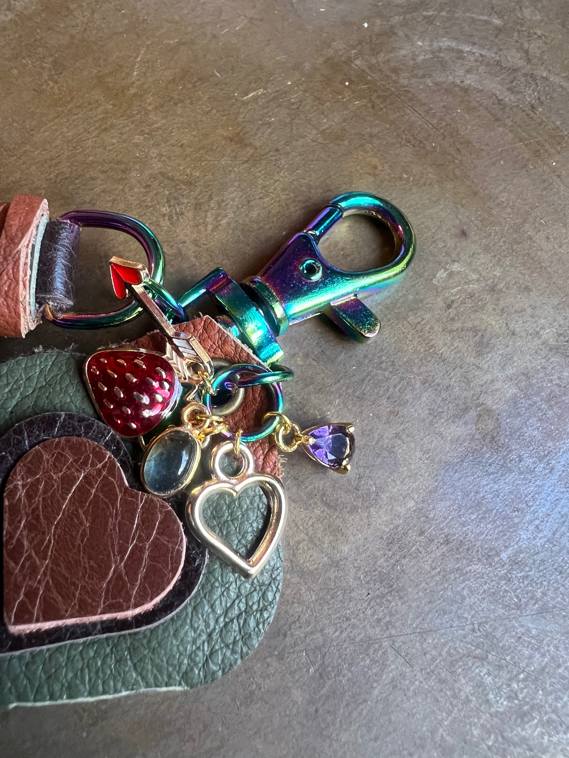 Features gold tone labradorite, amethyst; enamel strawberry, arrow, and heart charms.