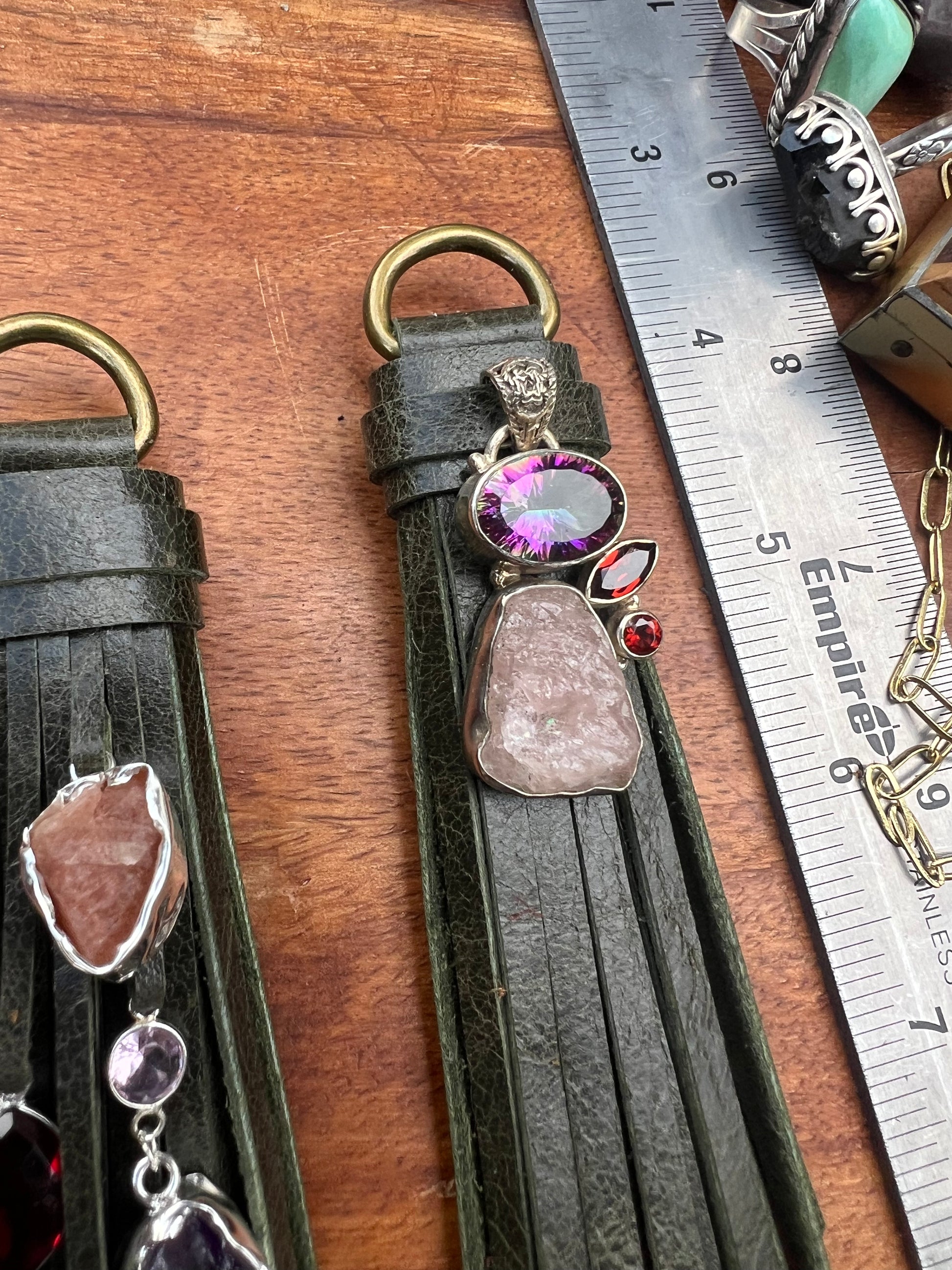 Featuring Rainbow Topaz, Morganite, Garnet and Rose Quartz pendant; sunstone, morganite, amethyst, garnet, and ruby.