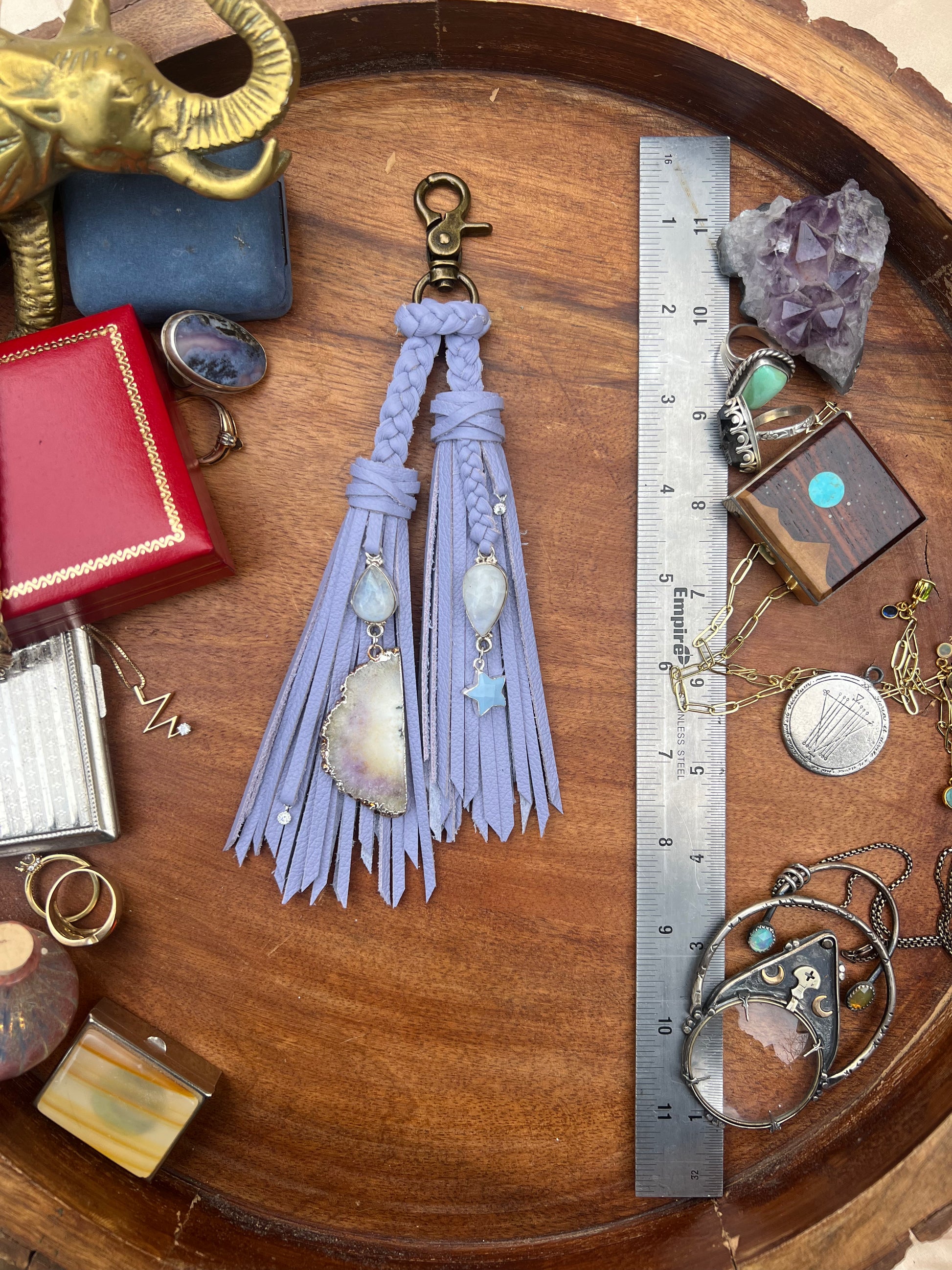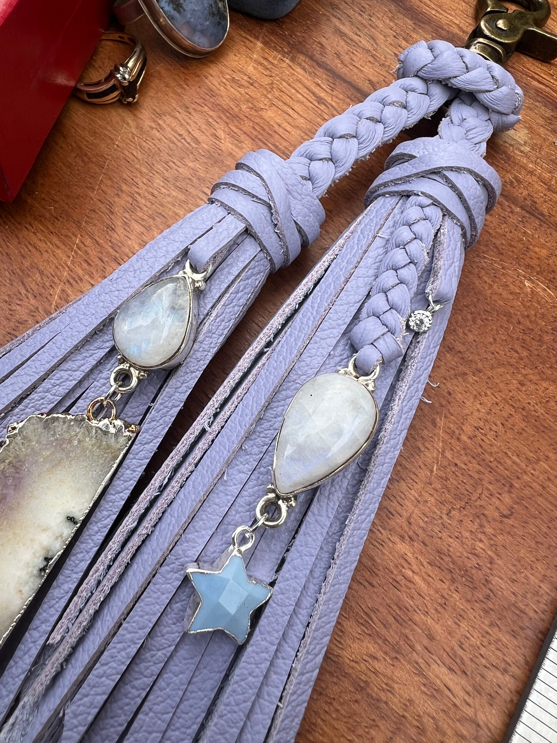 Features Moonstones, agate geode, cubic zirconias, and blue opal.