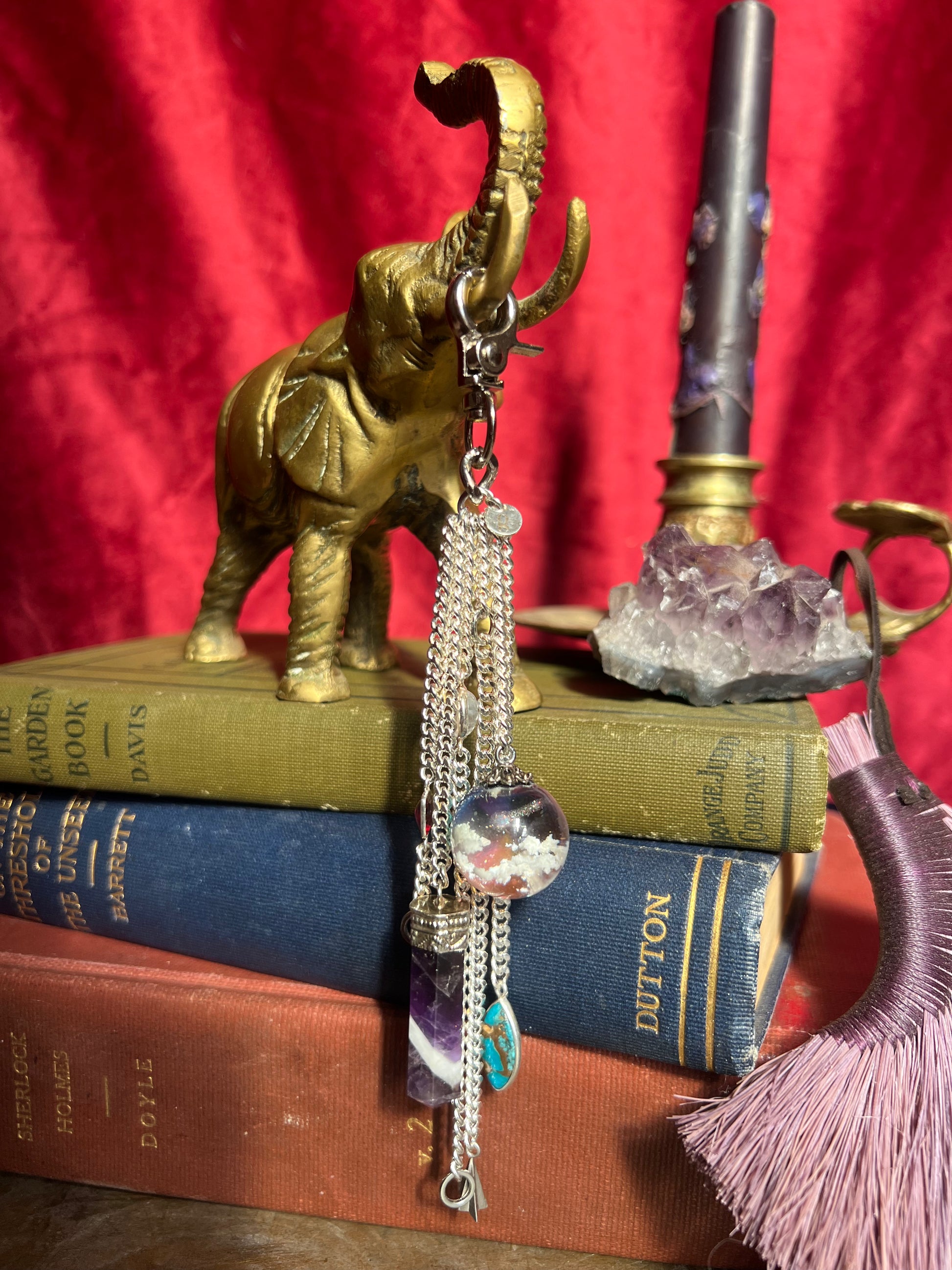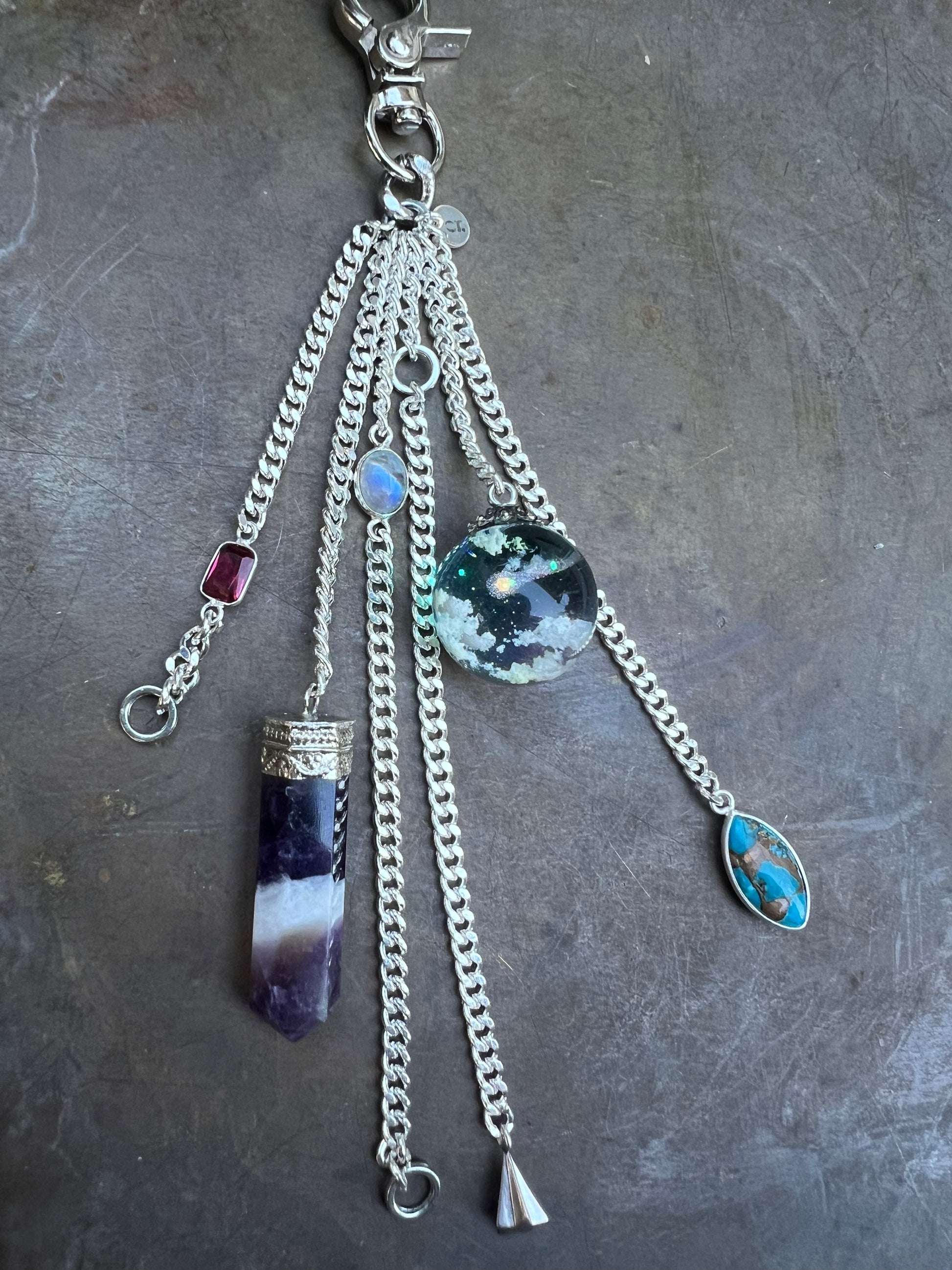 Pink tourmaline, amethyst, moonstone, star charm, comet/clouds resin bauble, and turquoise.