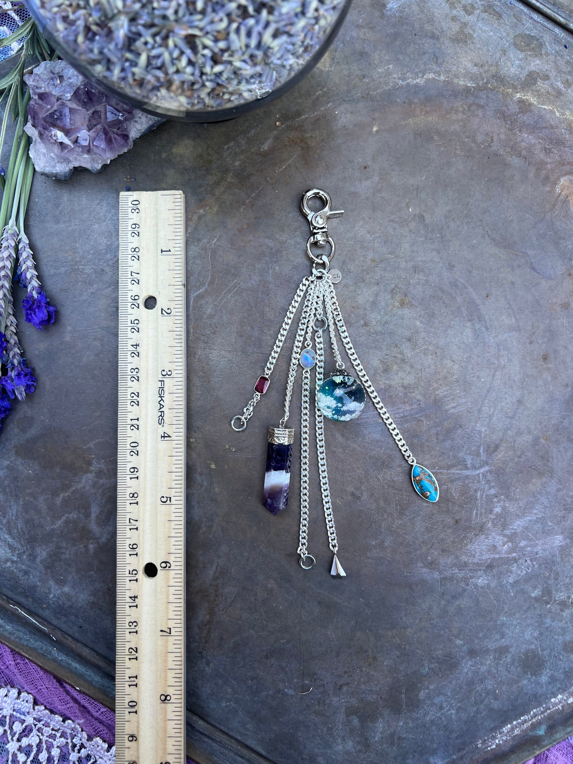 6.5" Steel Chain Tassel on clip with silver-detail charms and gems.