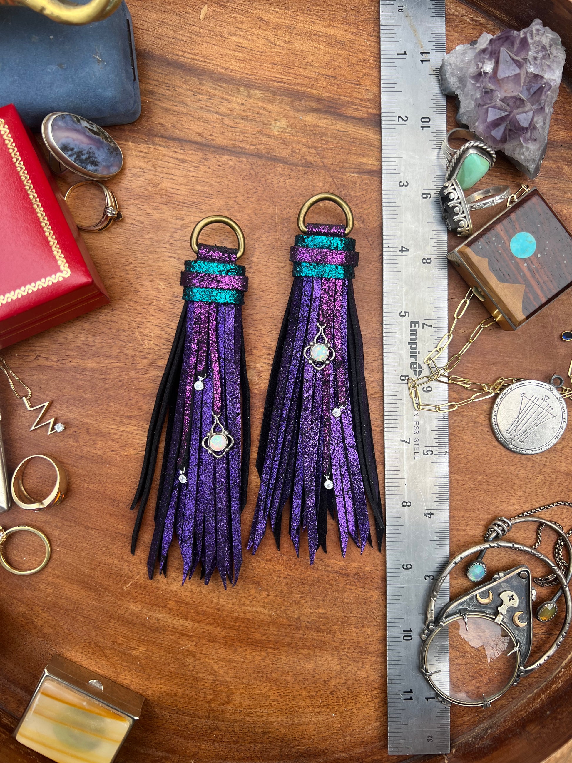 Features Opal pendants, and cubic zirconias.