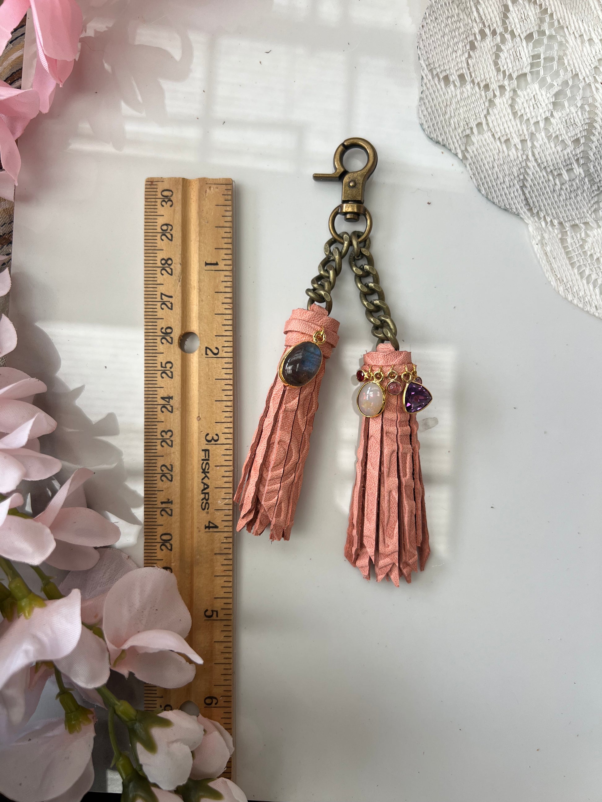 5" Peach embossed leather mini-double tassel.
