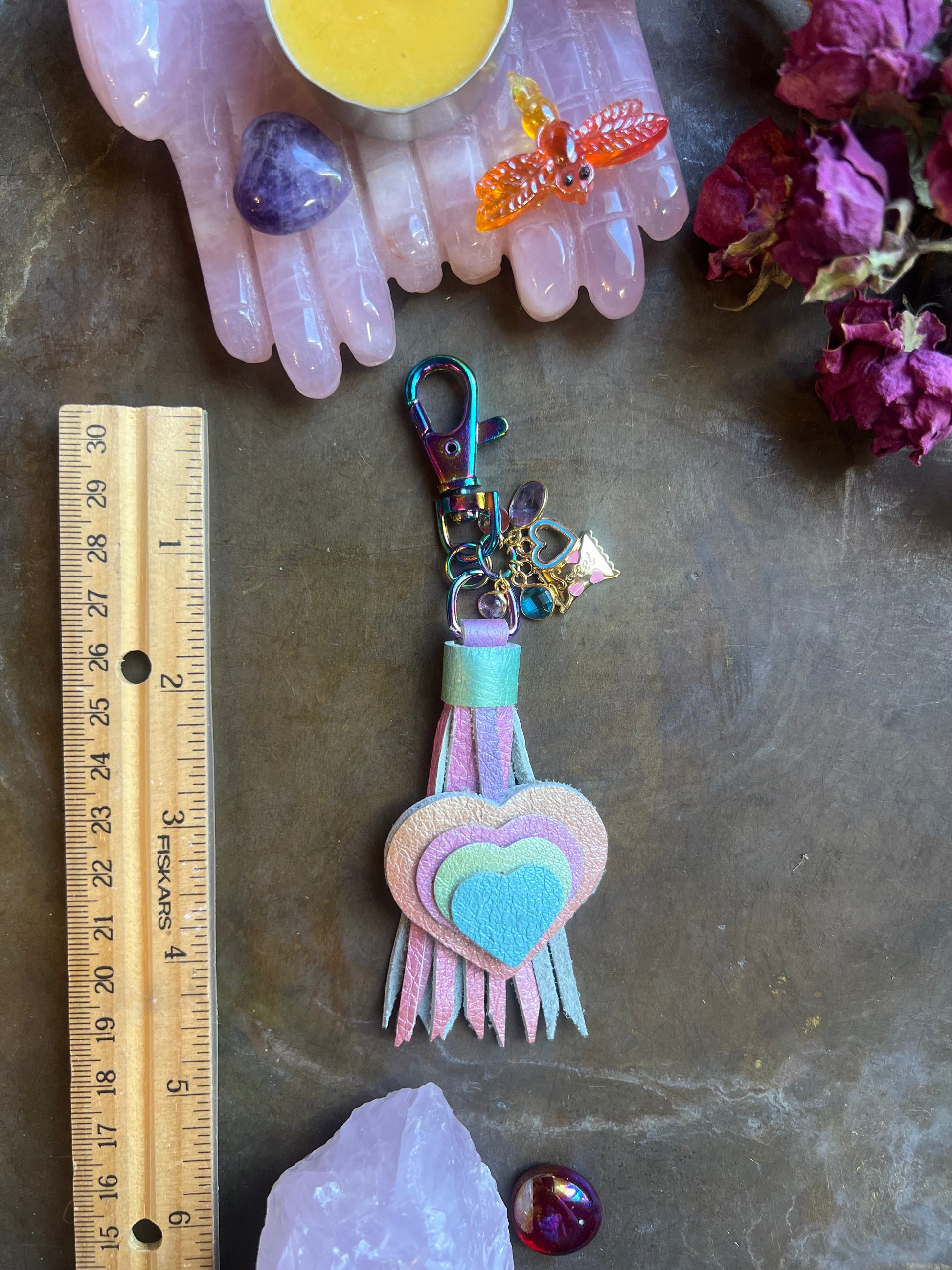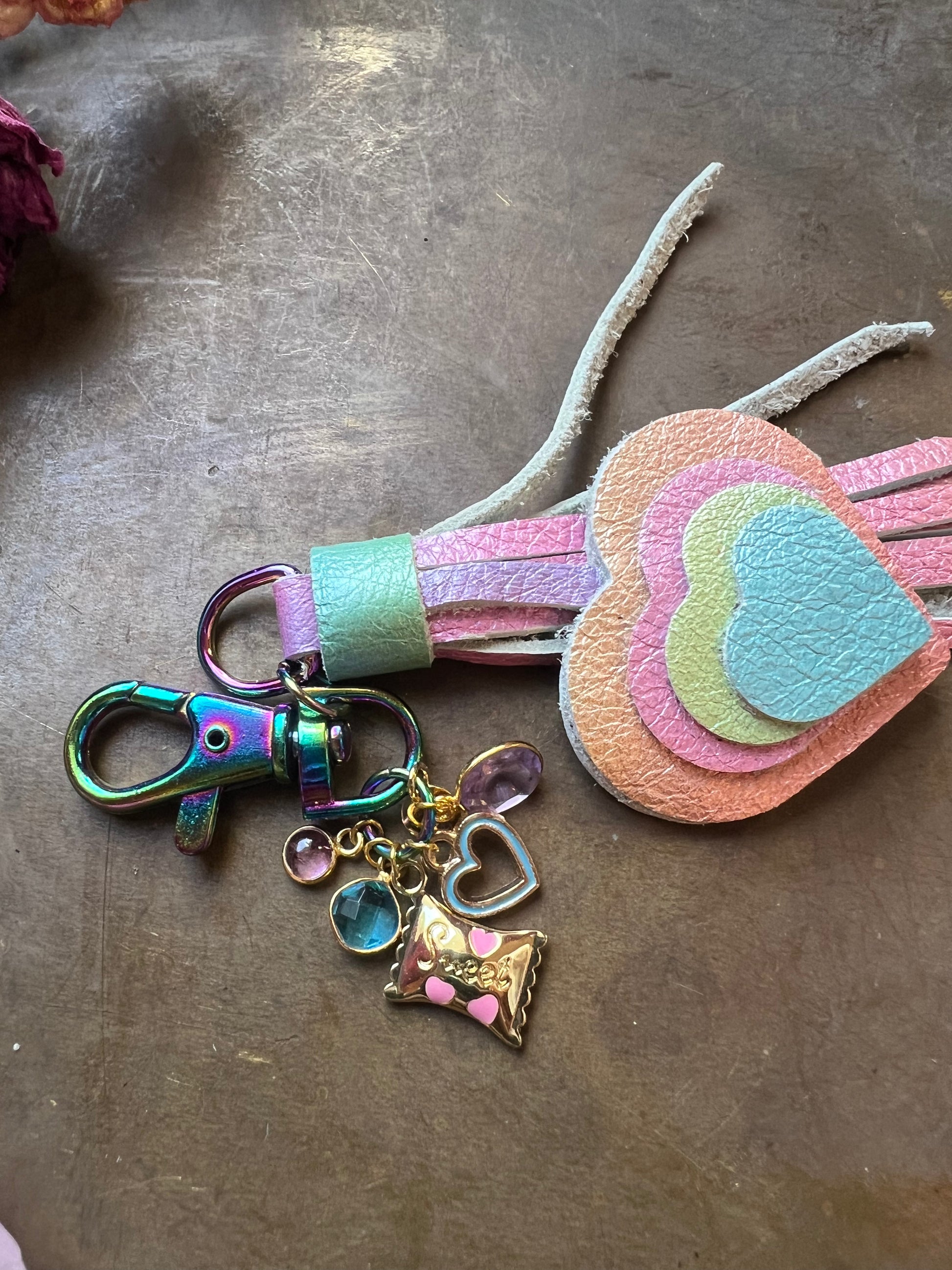 5" pastel rainbow leather on iridescent hardware, includes keyring (not pictured.)