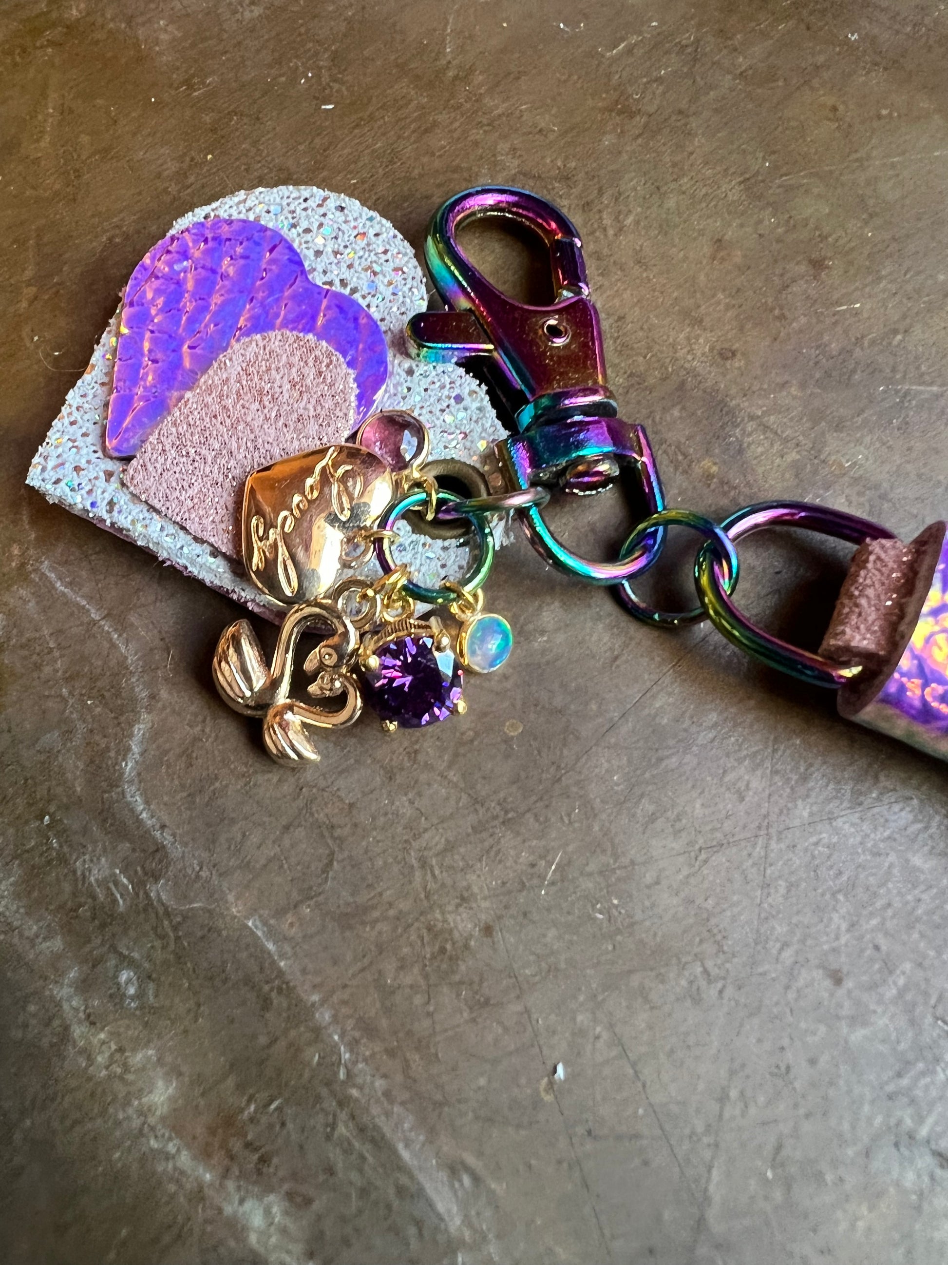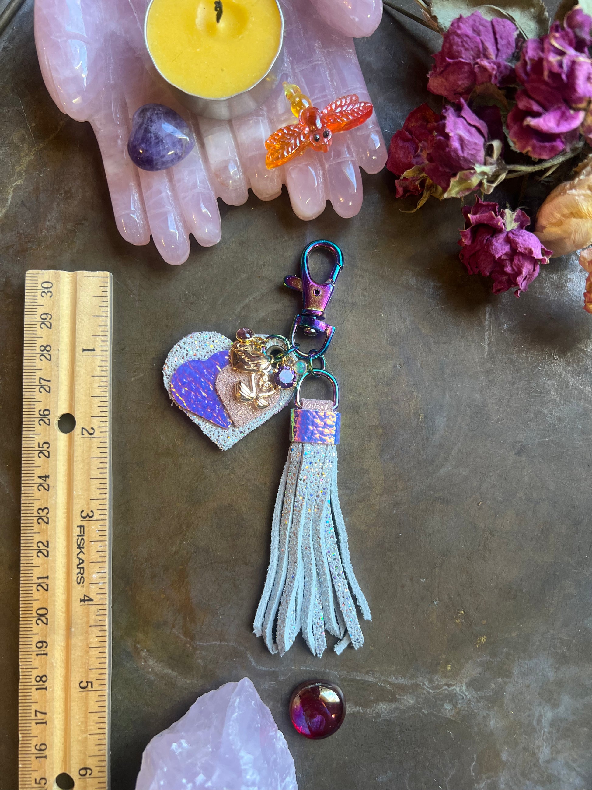 5" iridescent white sparkle leather tassel with "unicorn" and rose-gold on iridescent hardware, includes keyring (not pictured.)