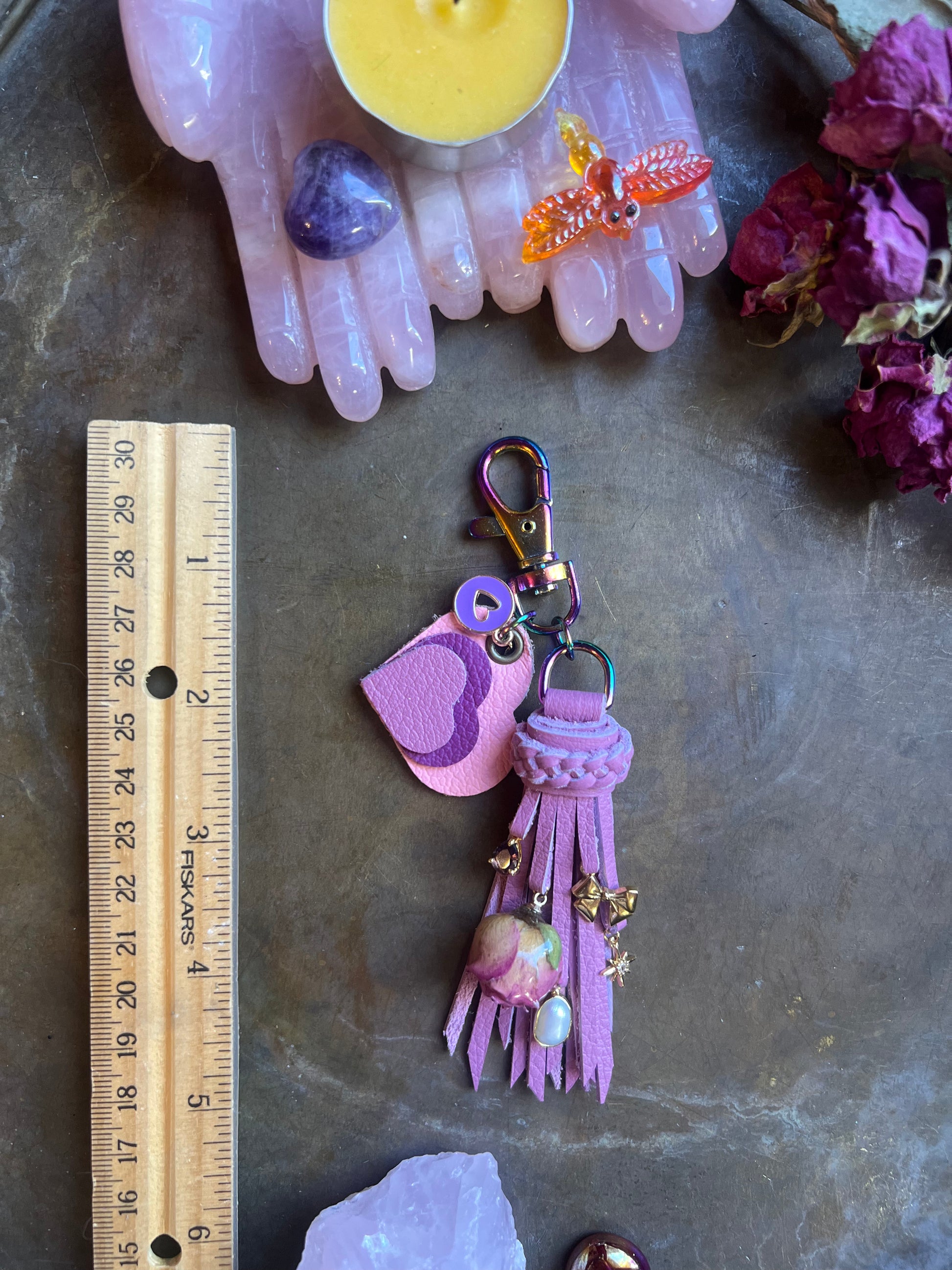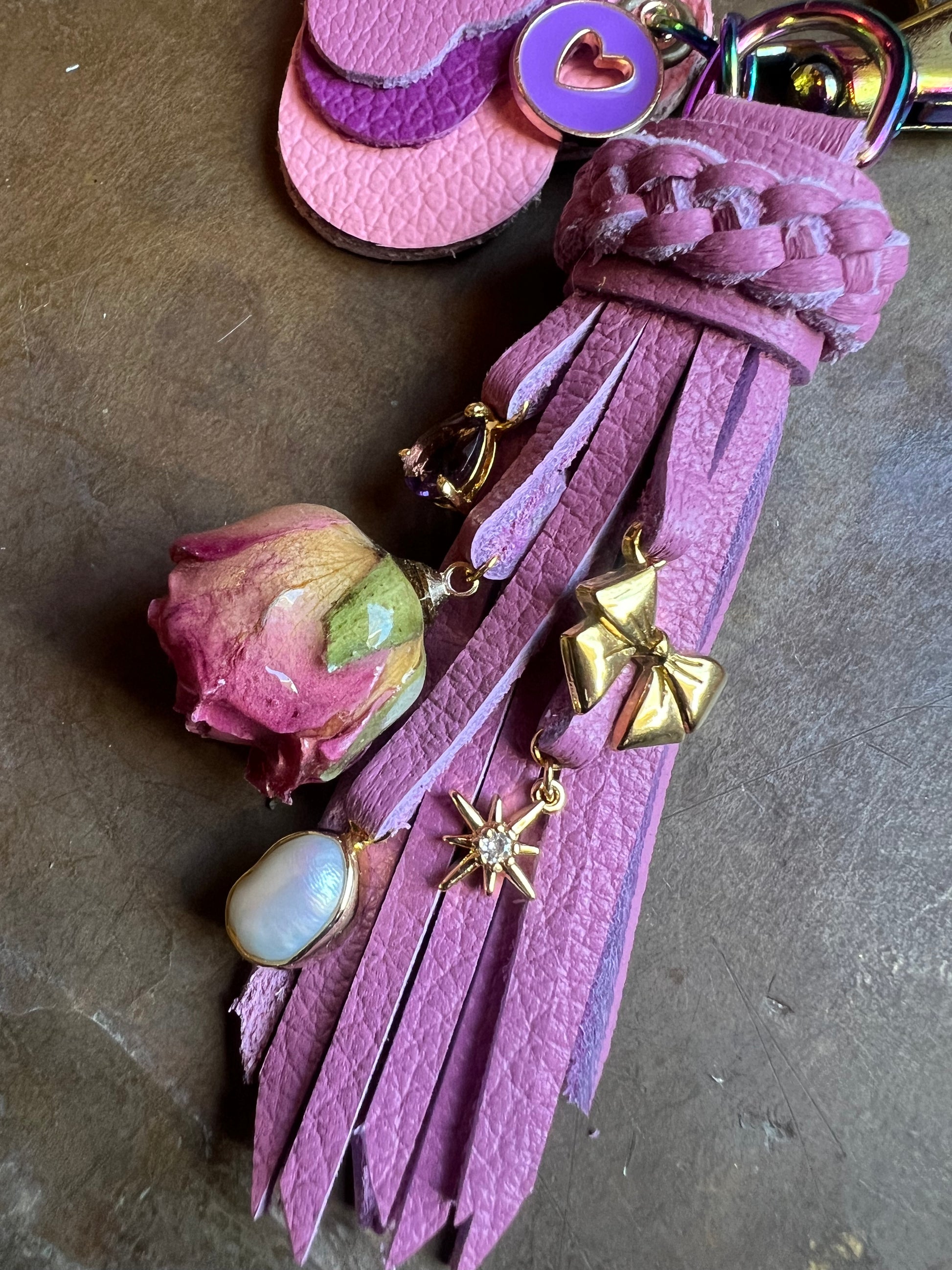 5" pink leathers on iridescent hardware, includes keyring (not pictured.)