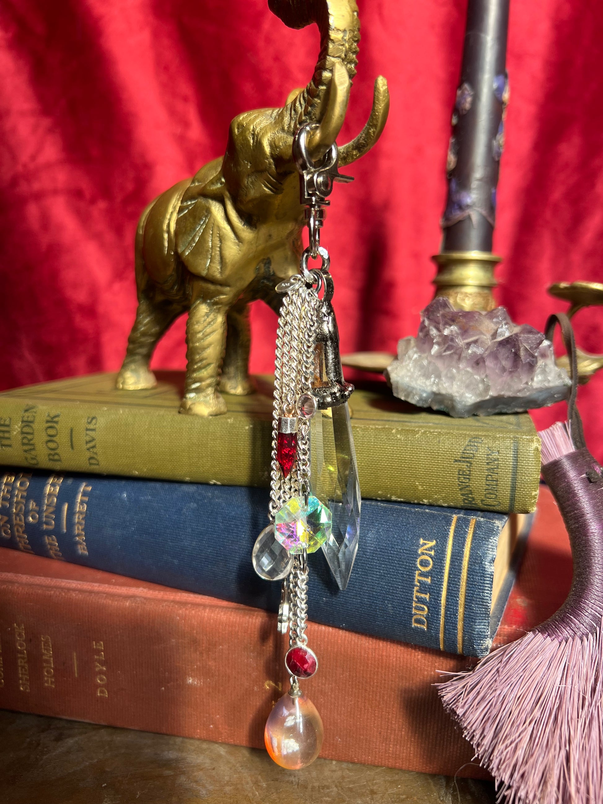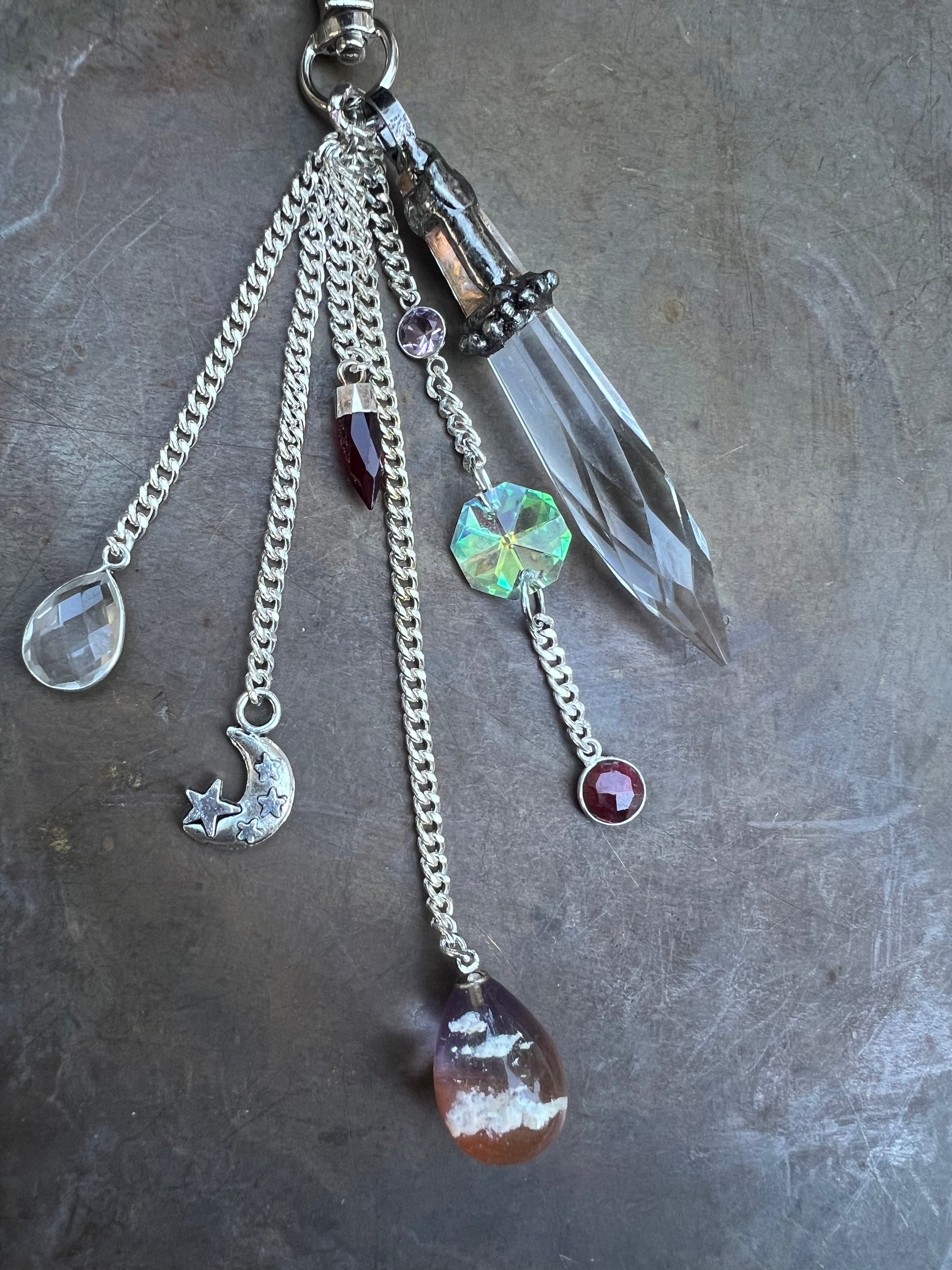 Morganite, suncatcher, ruby, sunrise resin bauble, garnet, moon charm, clear crystal, and crystal spear