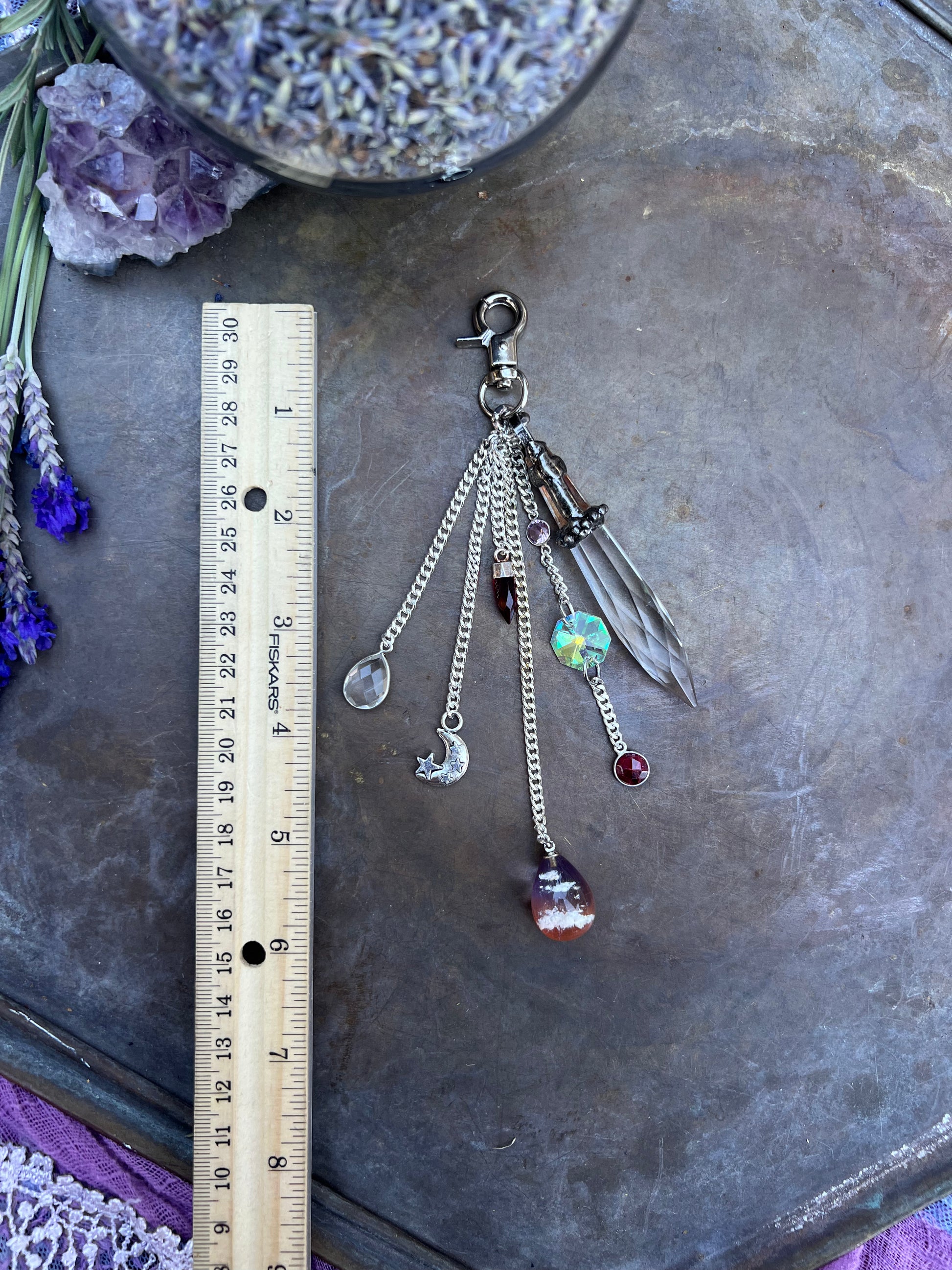 6" Steel Chain Tassel on clip with silver-detail charms and gems.