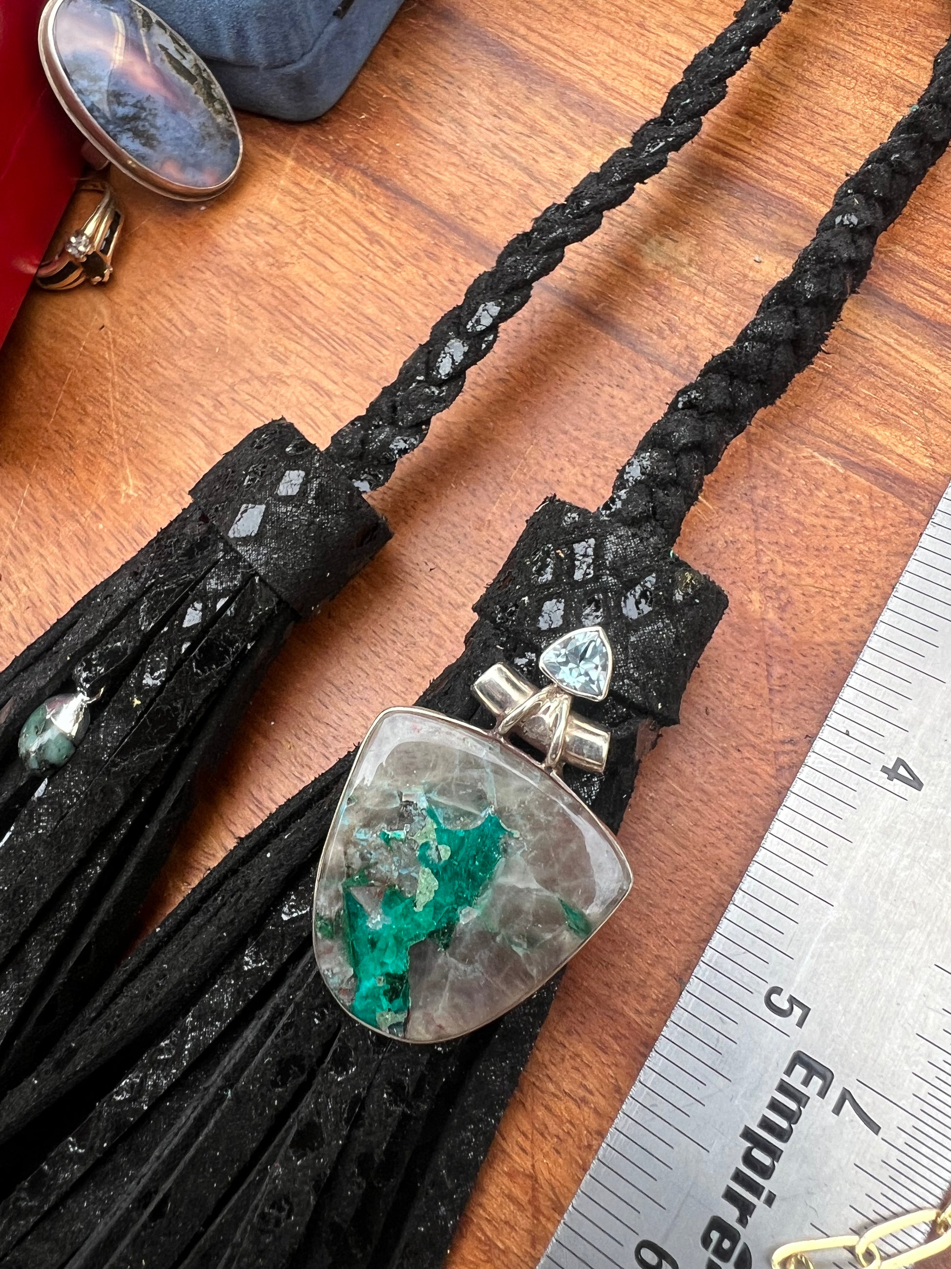 Features Dioptase, emeralds, dendritic opal, and cubic zirconias.