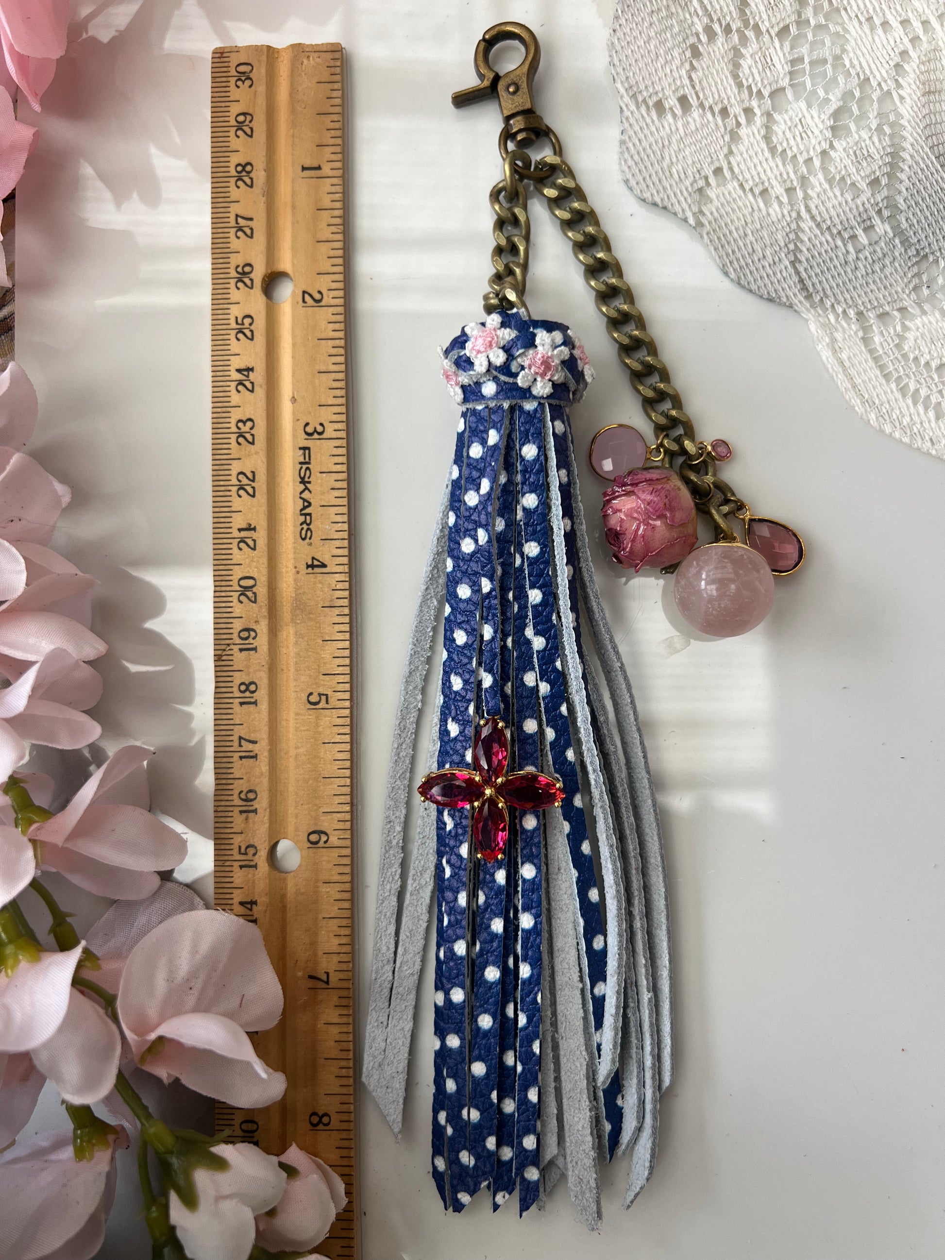 8.5" Blue and white polka-dot leather single tassel with chain.