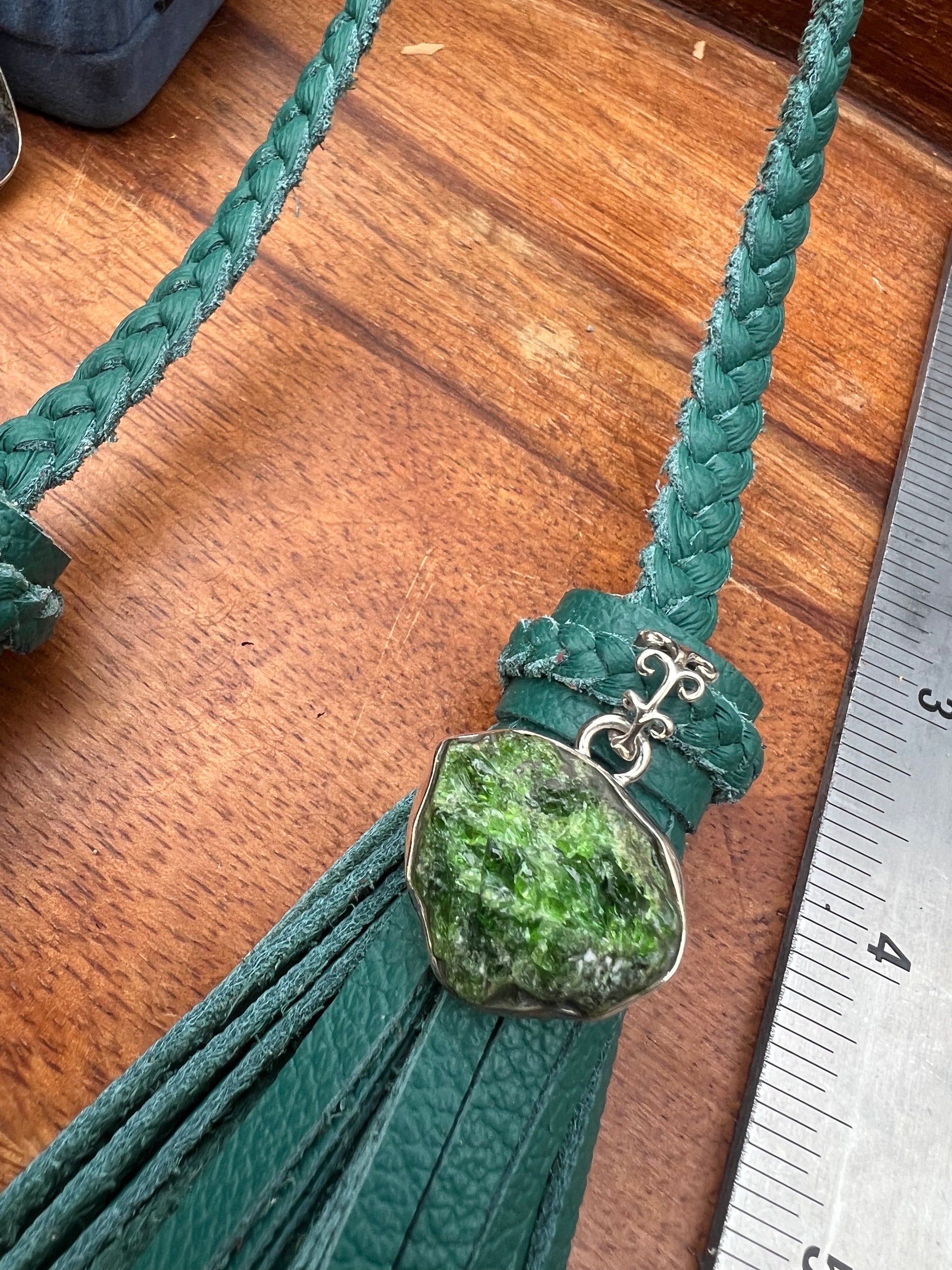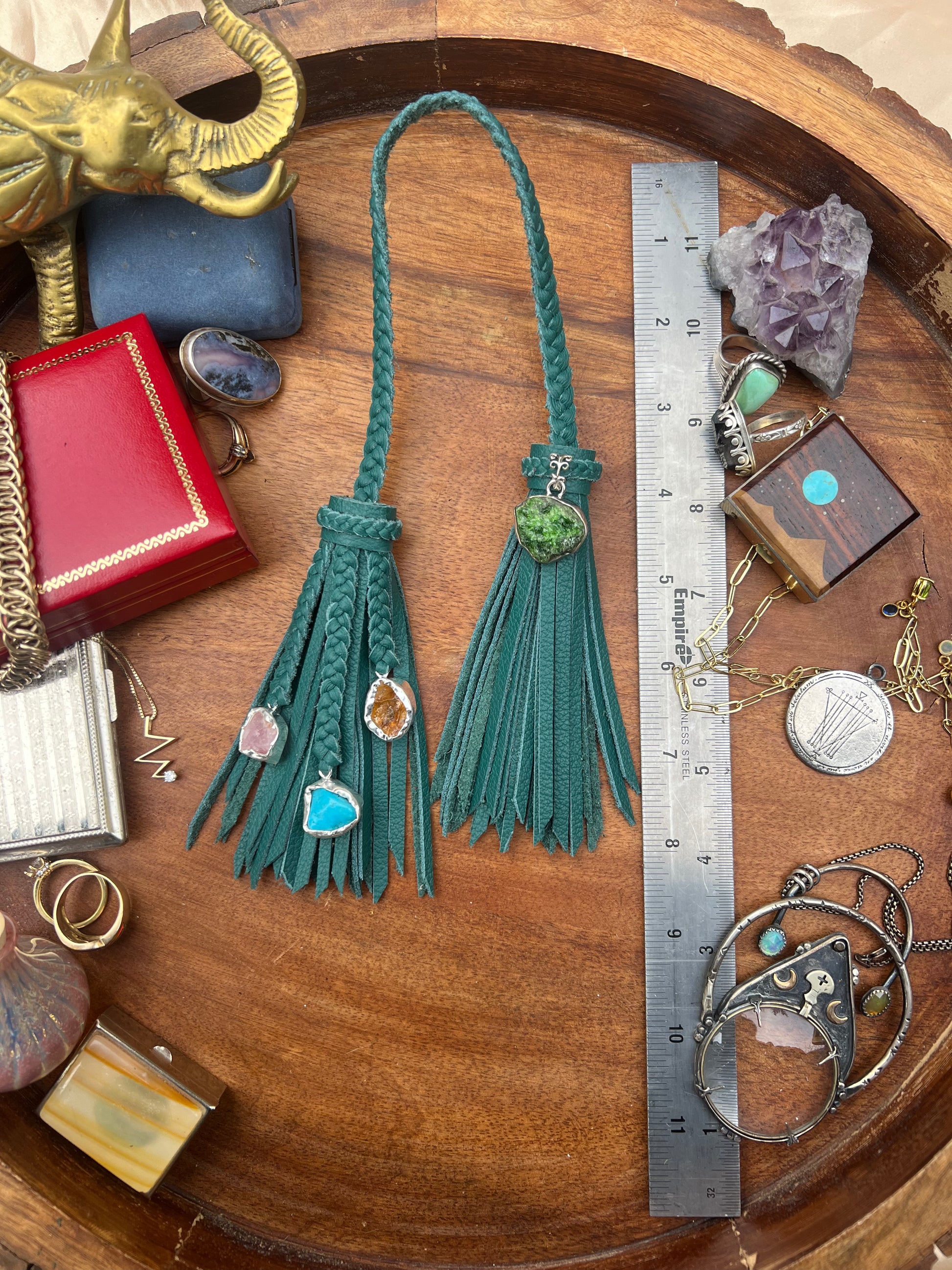 4" Teal leather (photo reads very green, but this is blue-ish teal) double-tassel.