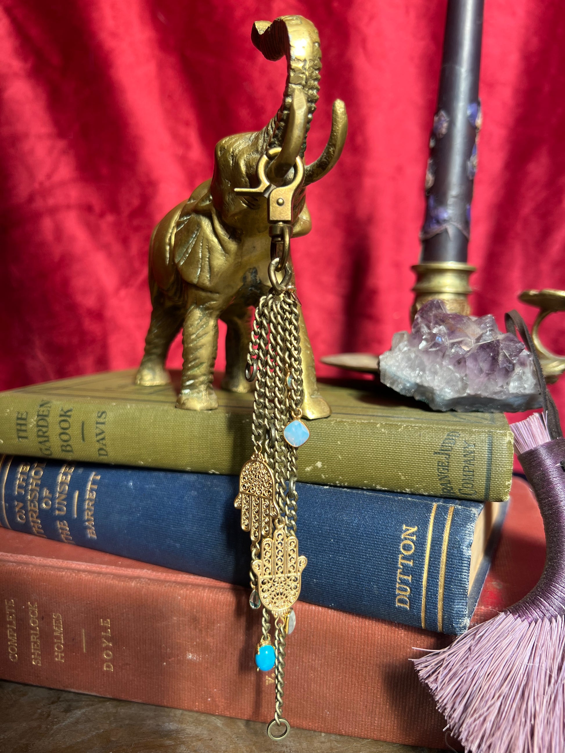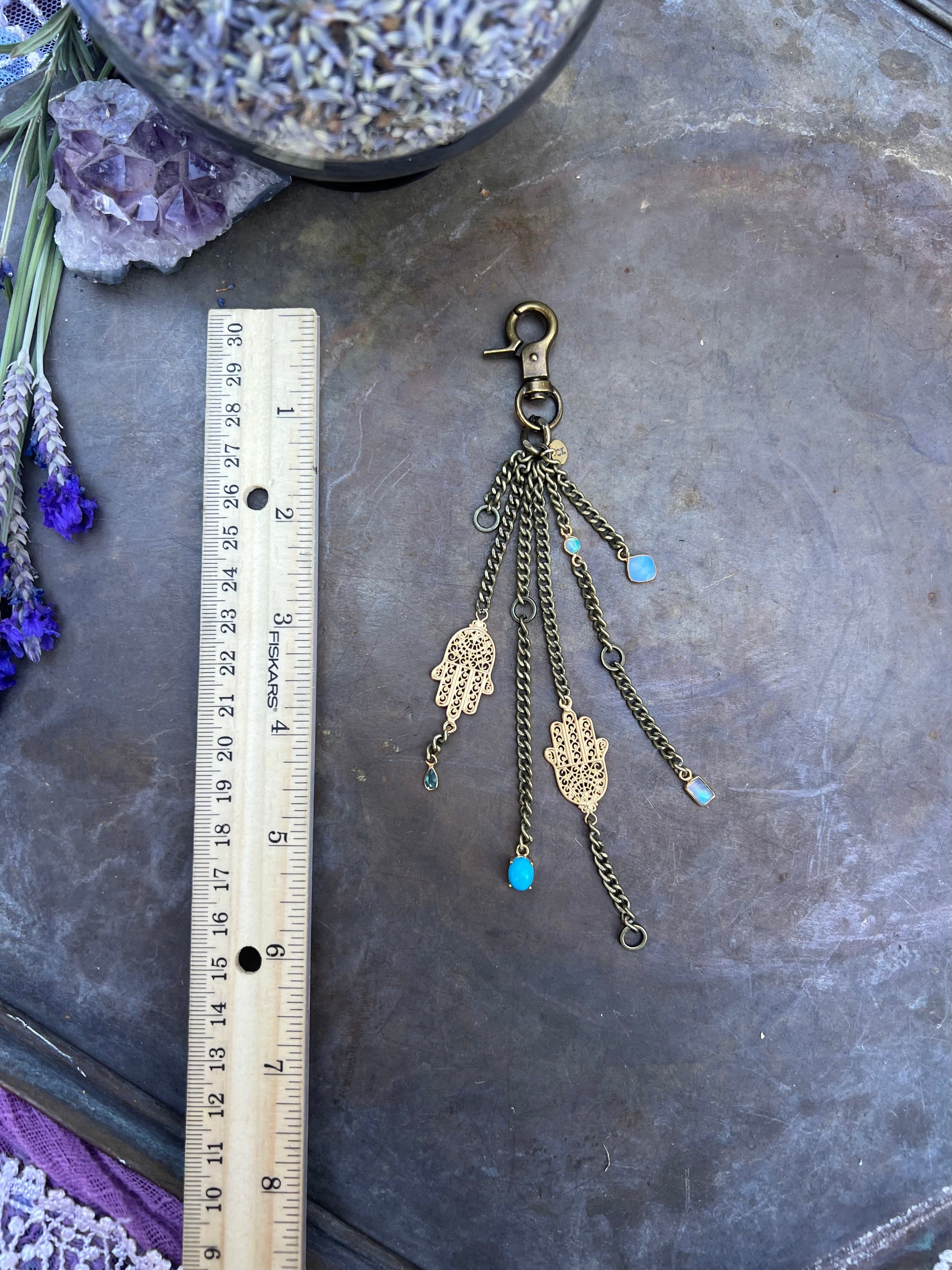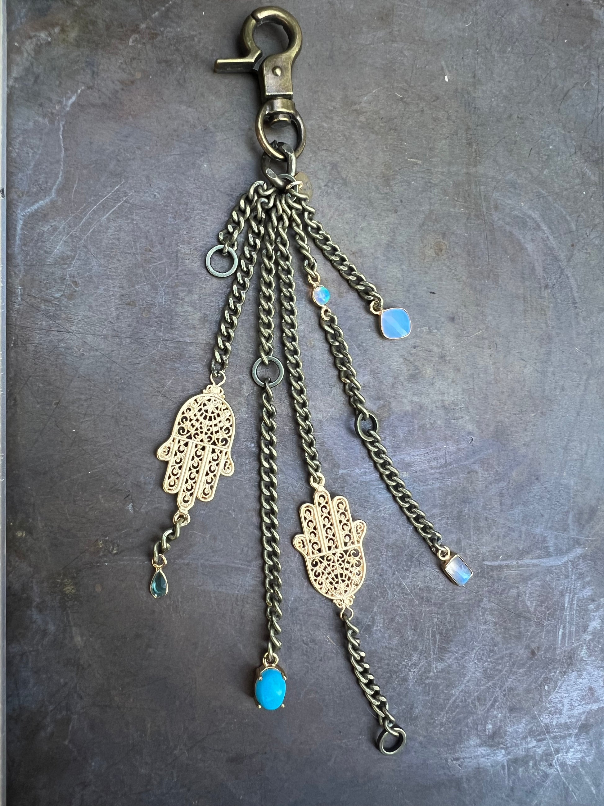 6" Bronze Chain Tassel on clip with gold-detail charms and gems.