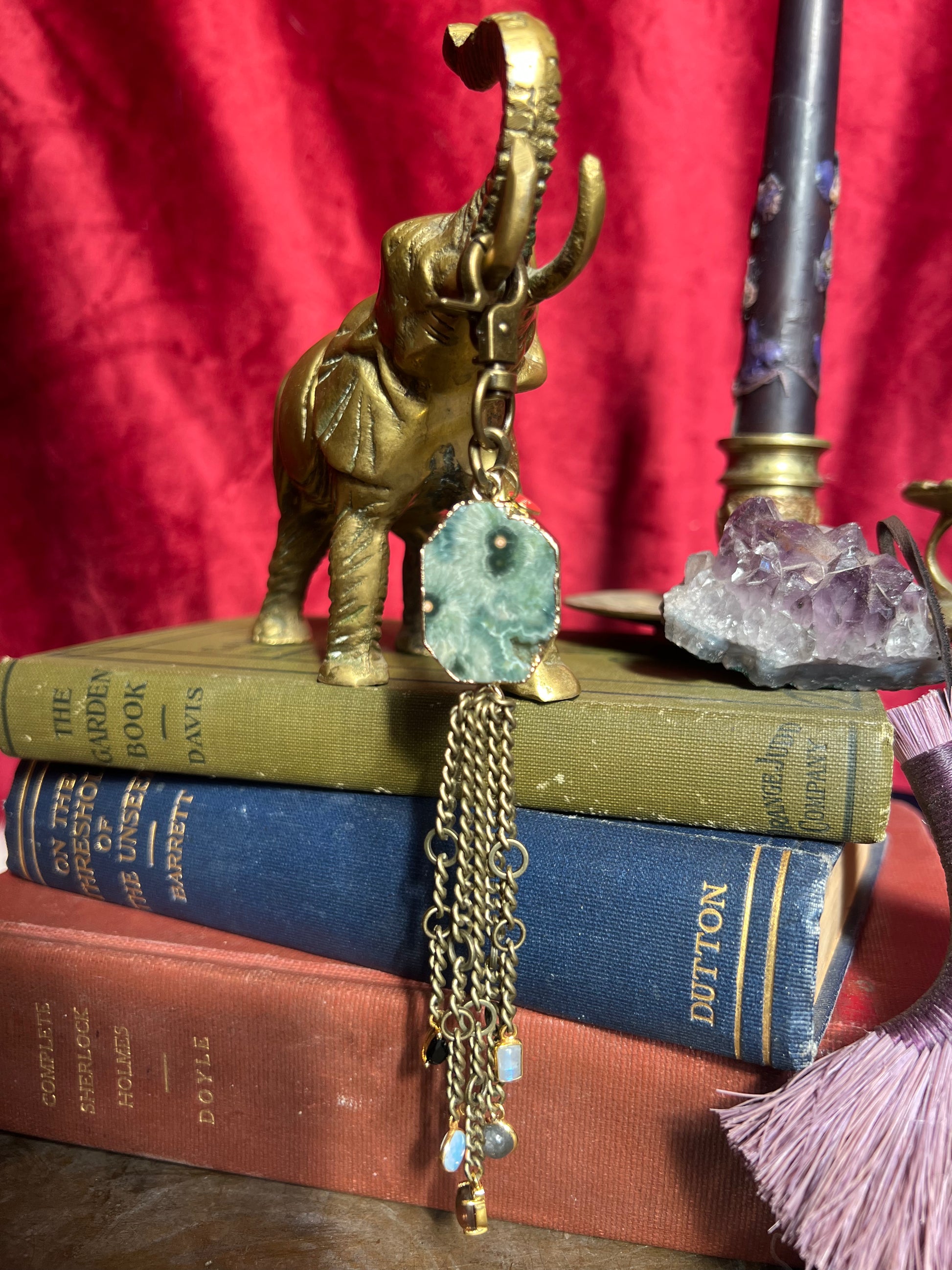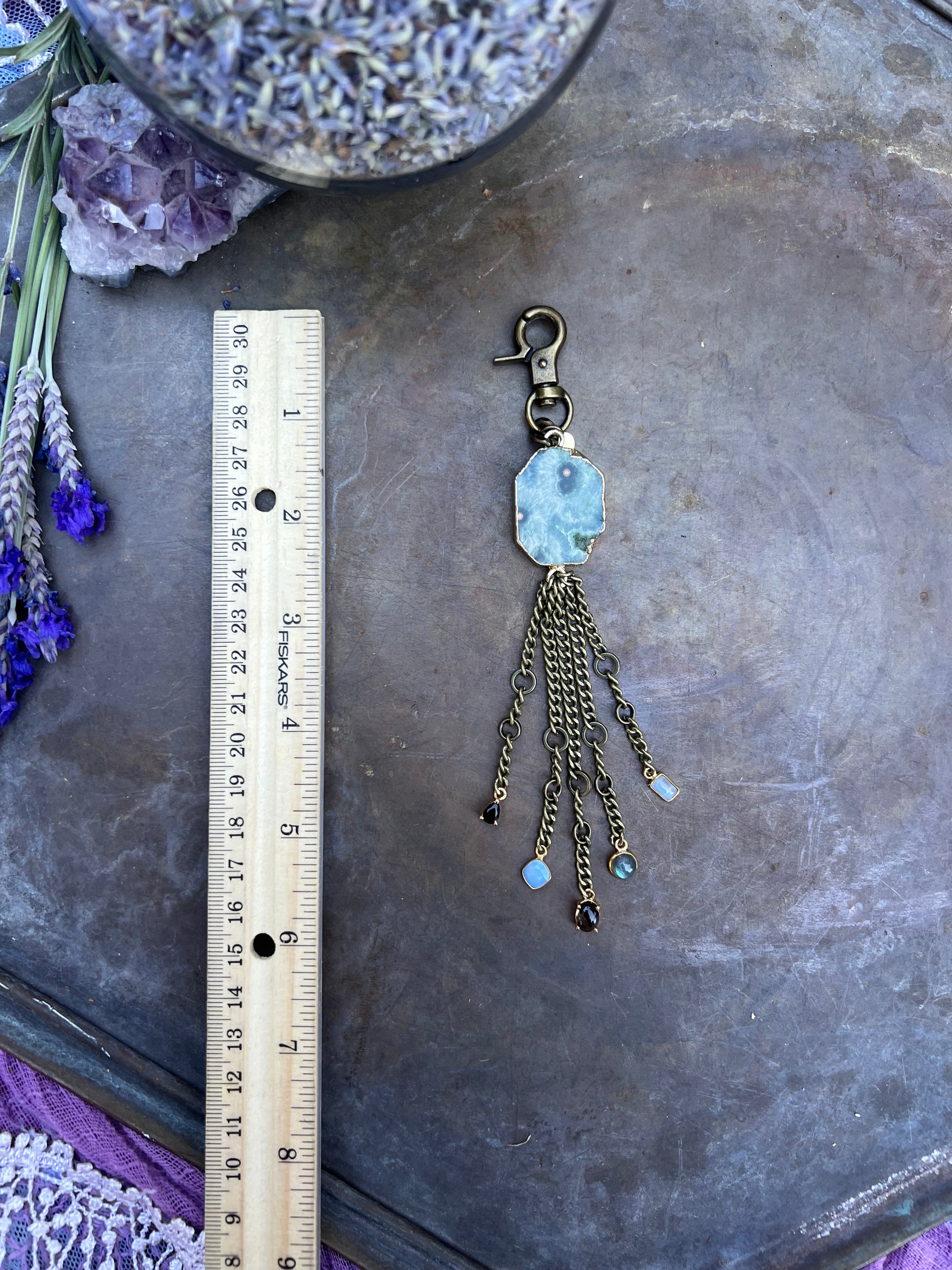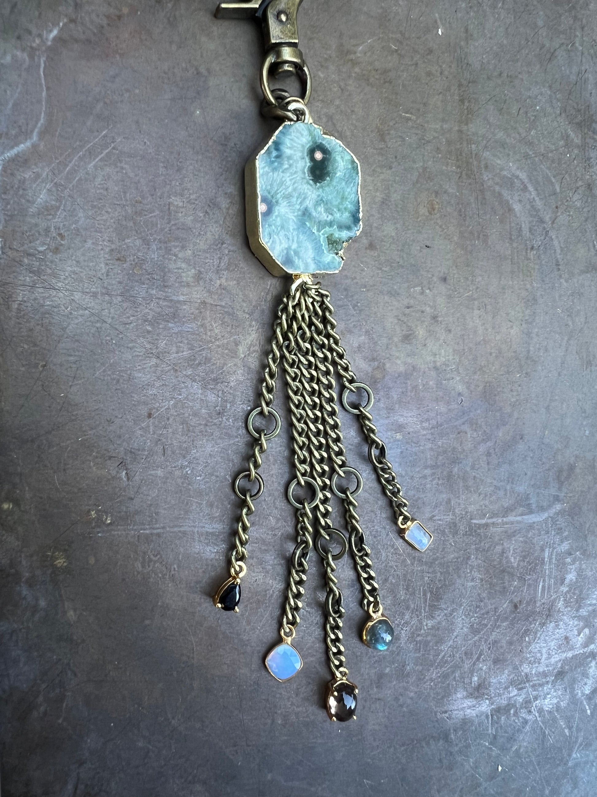 6" Bronze Chain Tassel on clip with gold-detail charms and gems.