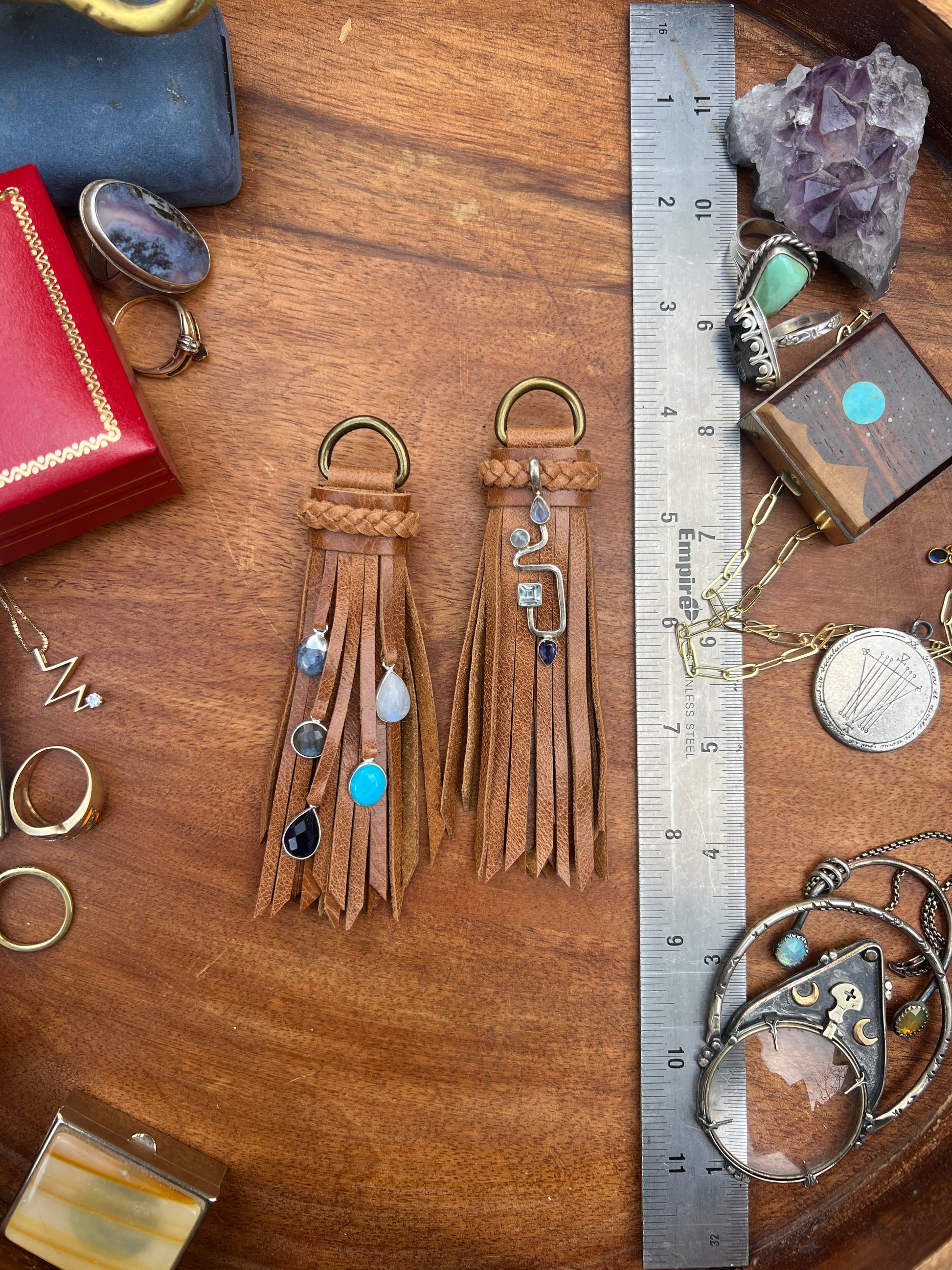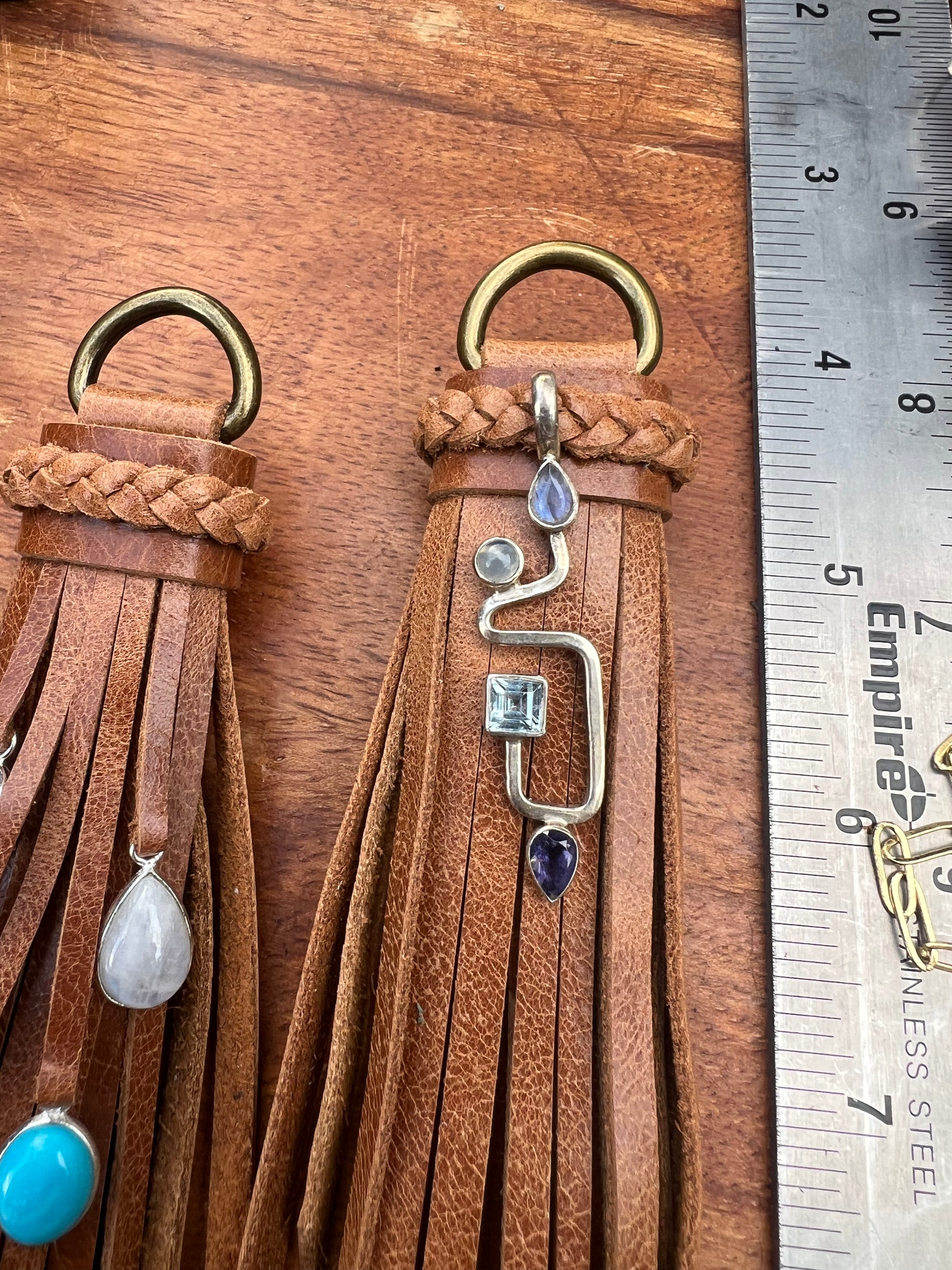 Features Silver pendant with Topaz, Moonstone, Aquamarine, and Amethyst; kyanite, moonstone, labradorite, turquoise, and sapphire.