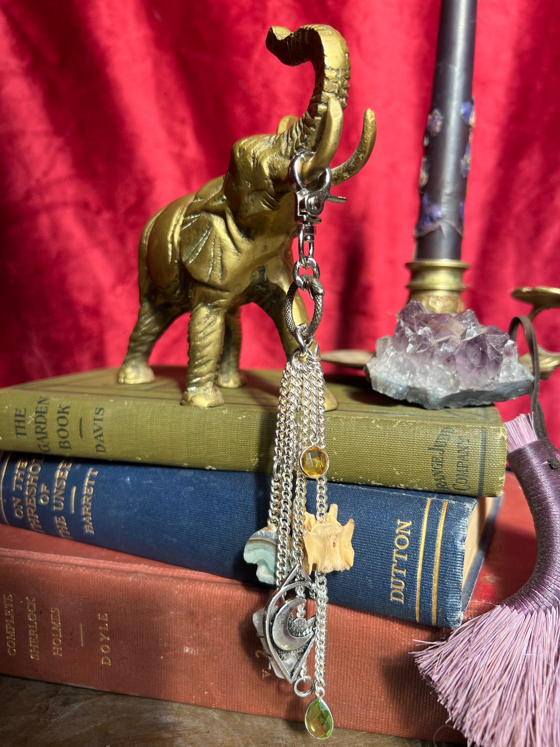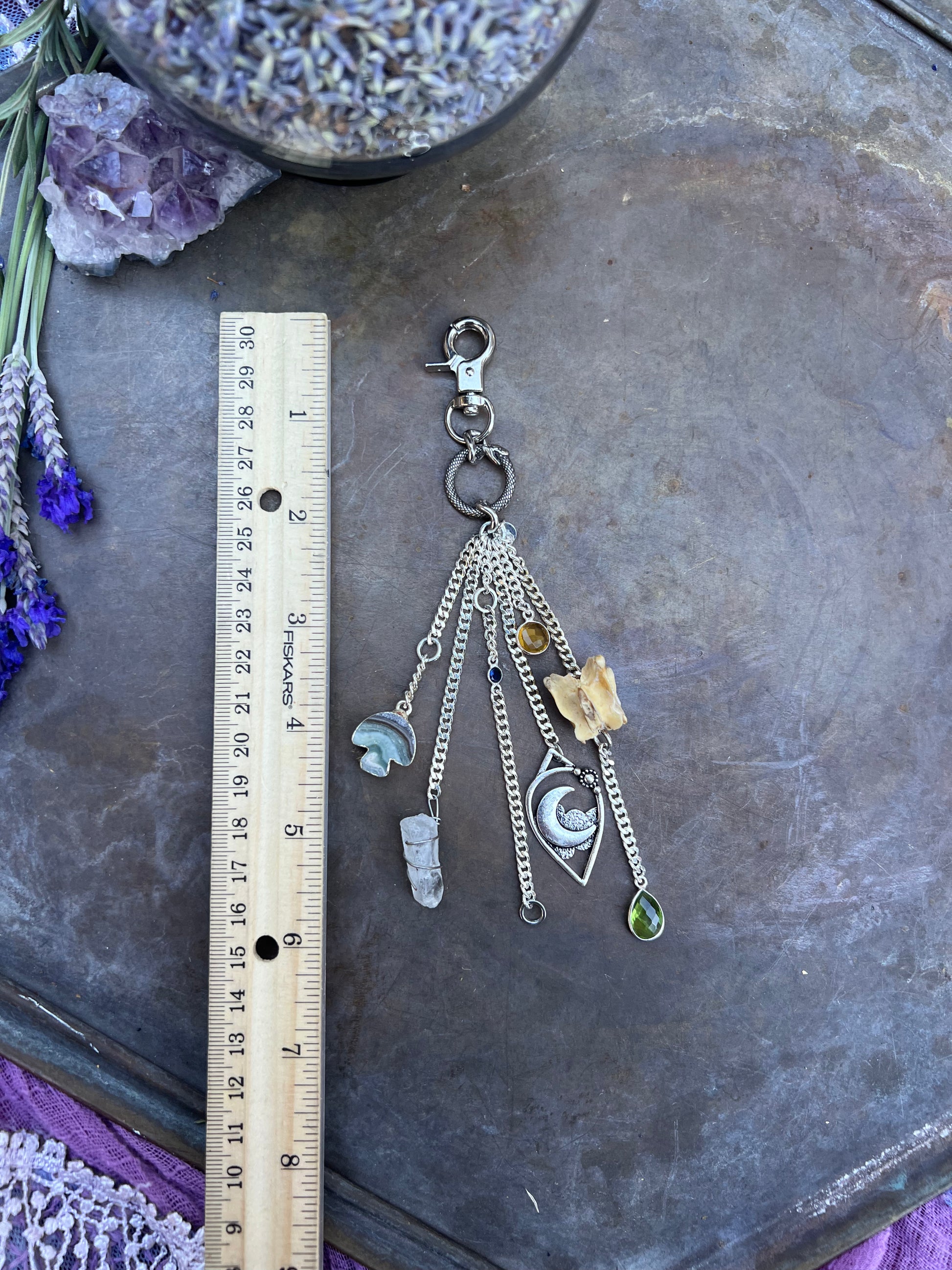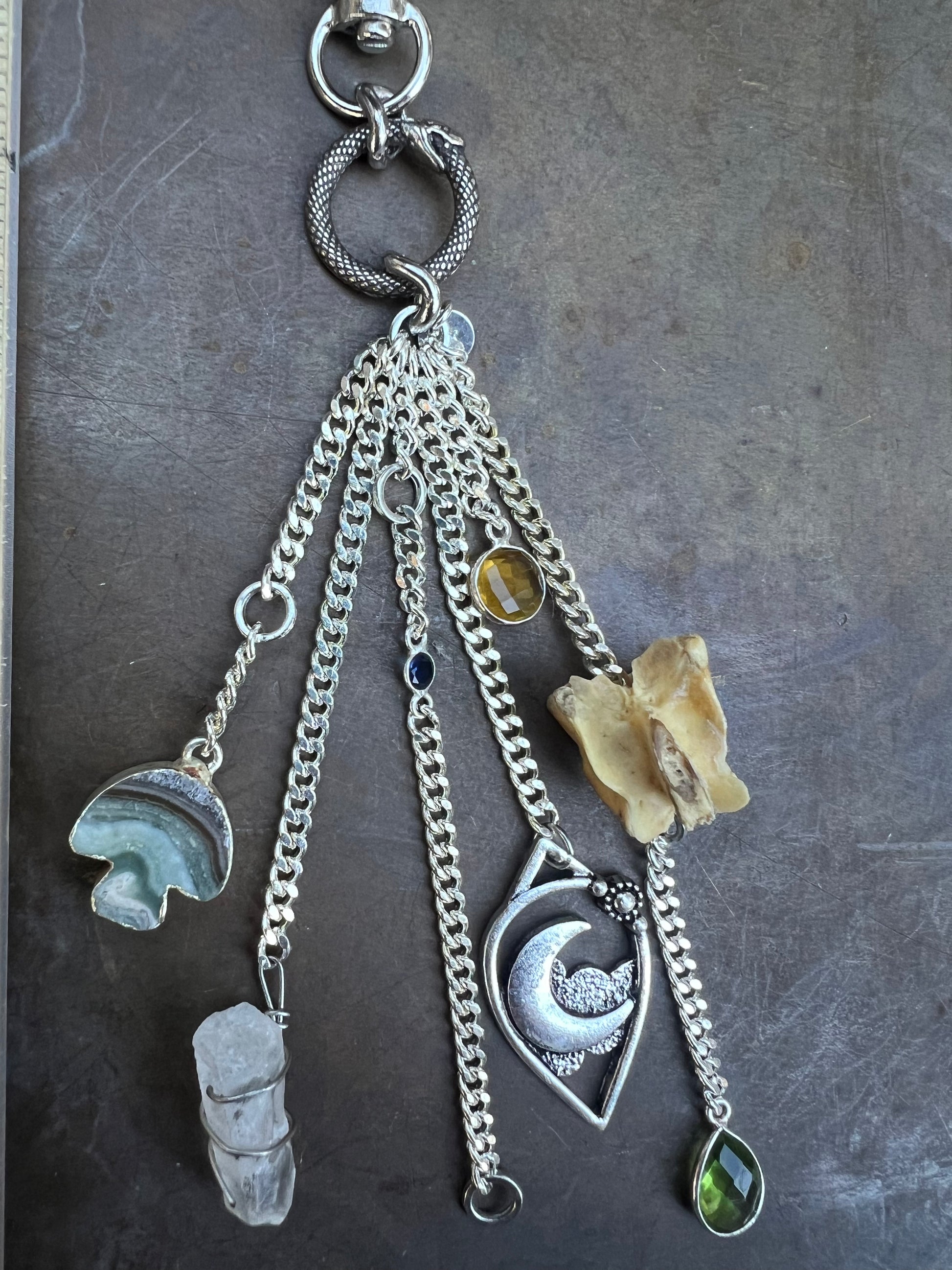 Serpent ring charm, agate mushroom, clear quartz, sapphire, moon charm, citrine, peridot, and genuine vertebrae.