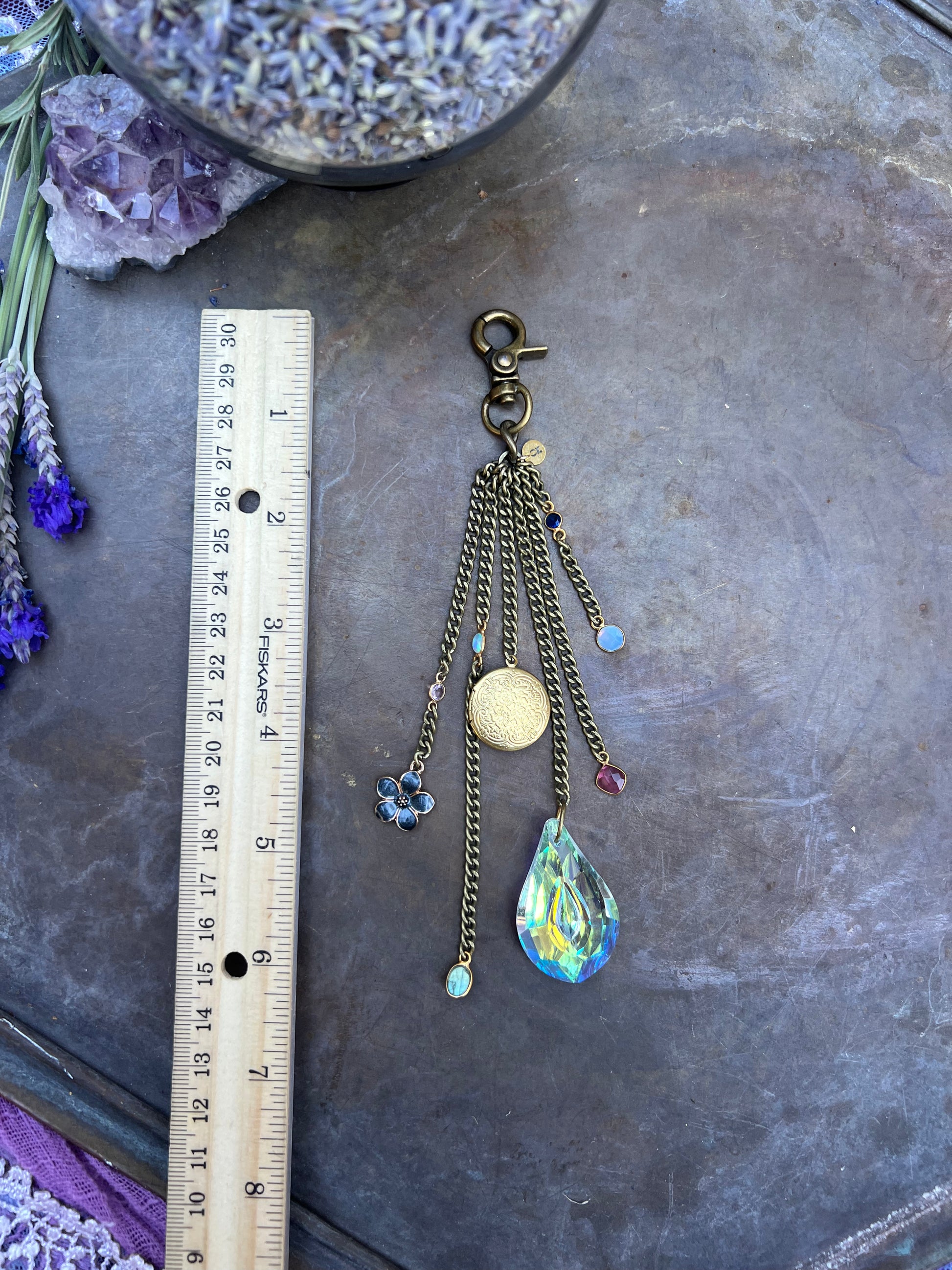 6.5" Bronze Chain Tassel on clip with gold-detail charms and gems.