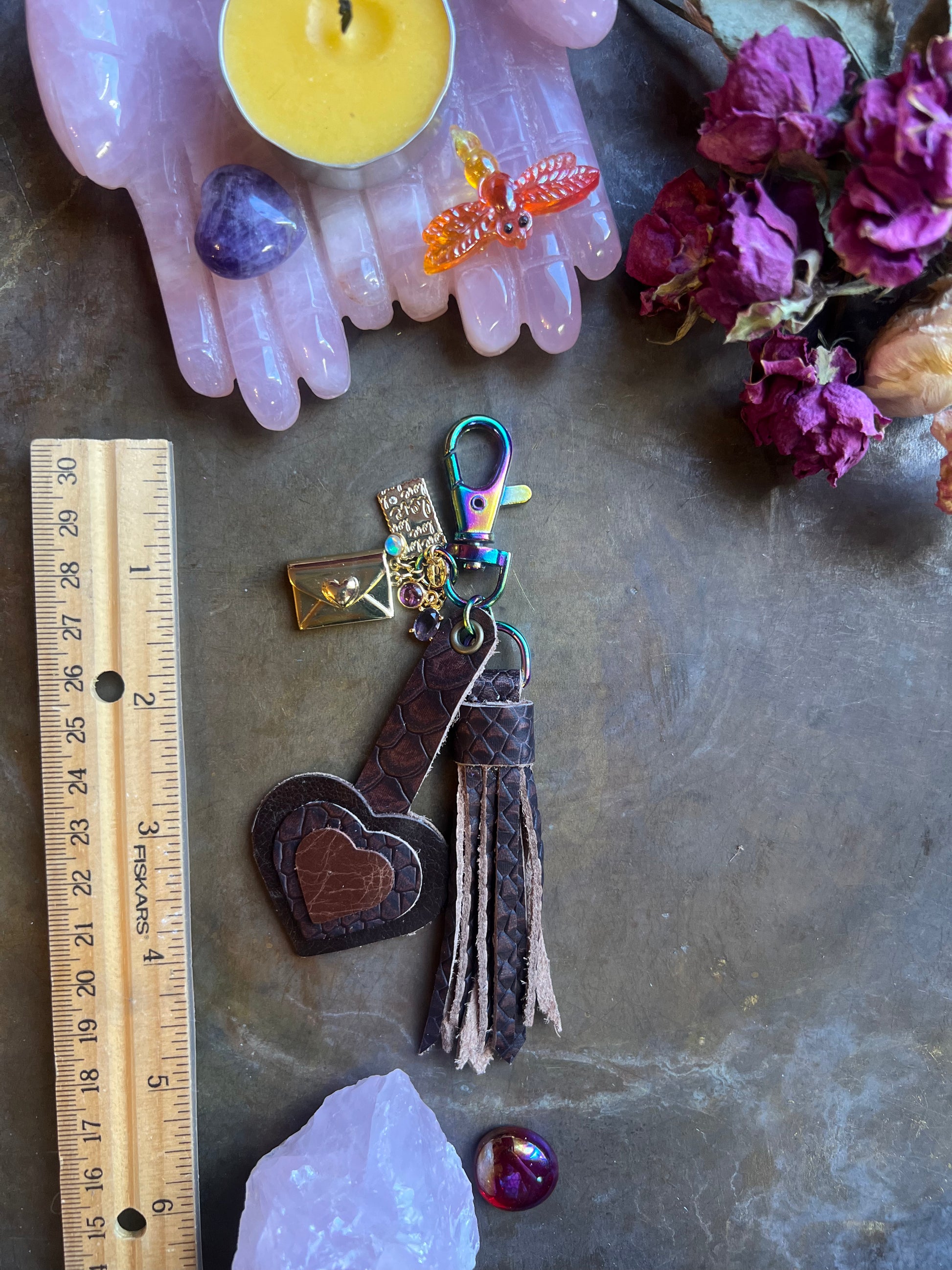 5" brown python embossed leather on iridescent hardware, includes keyring (not pictured.)