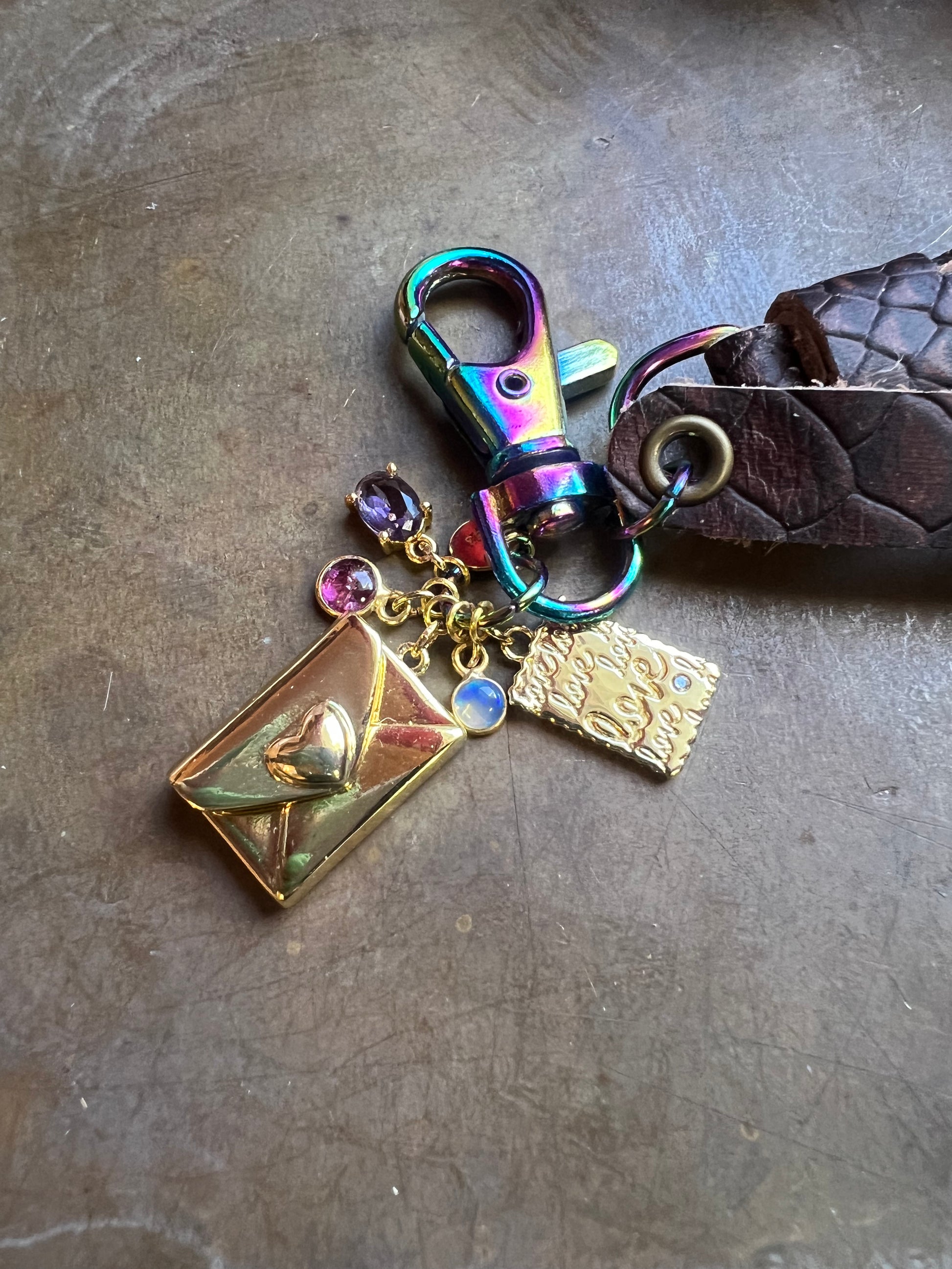 Features gold tone Ethiopian opal, pink tourmaline, amethyst; engraved letter and envelope charms.