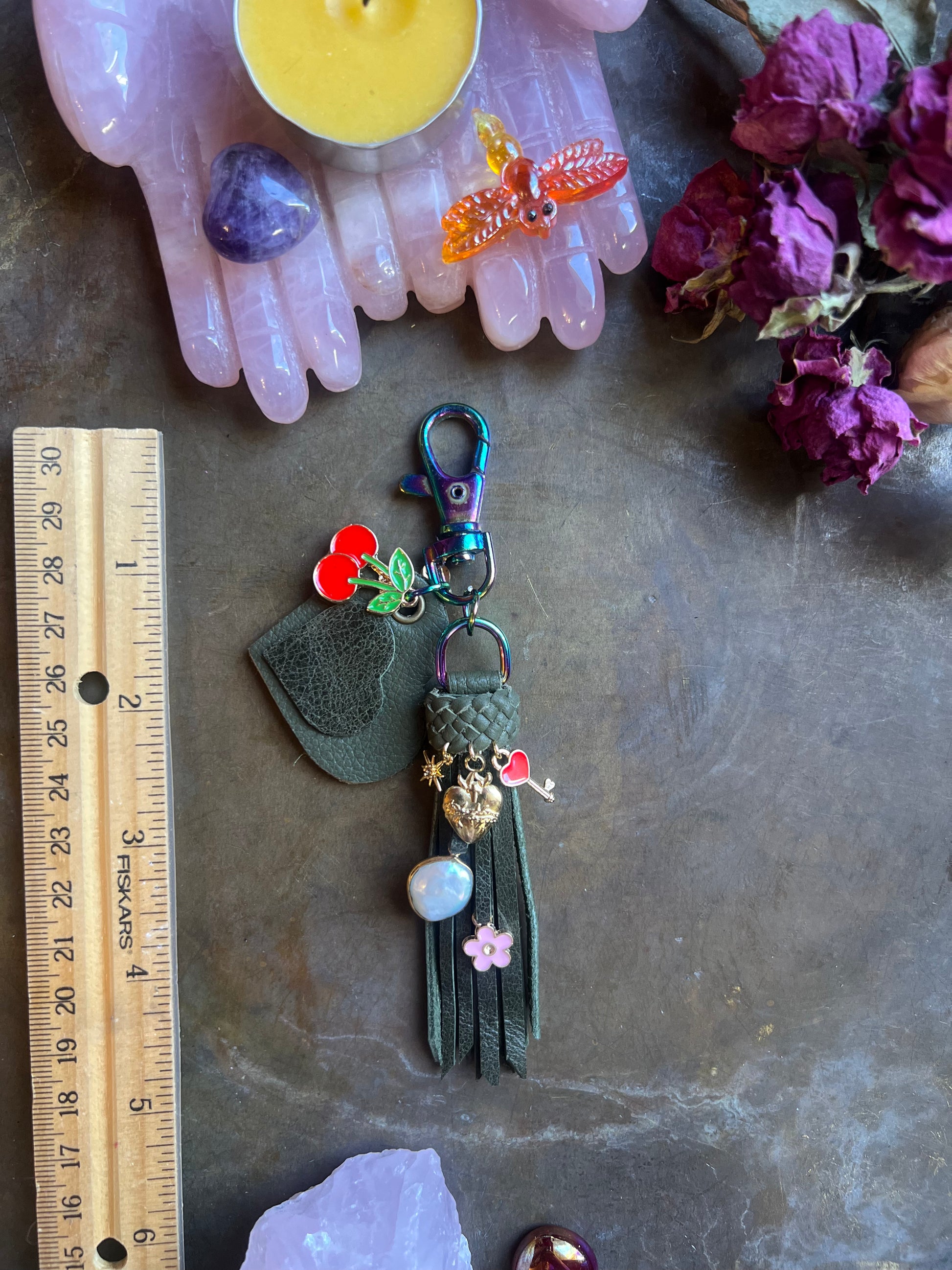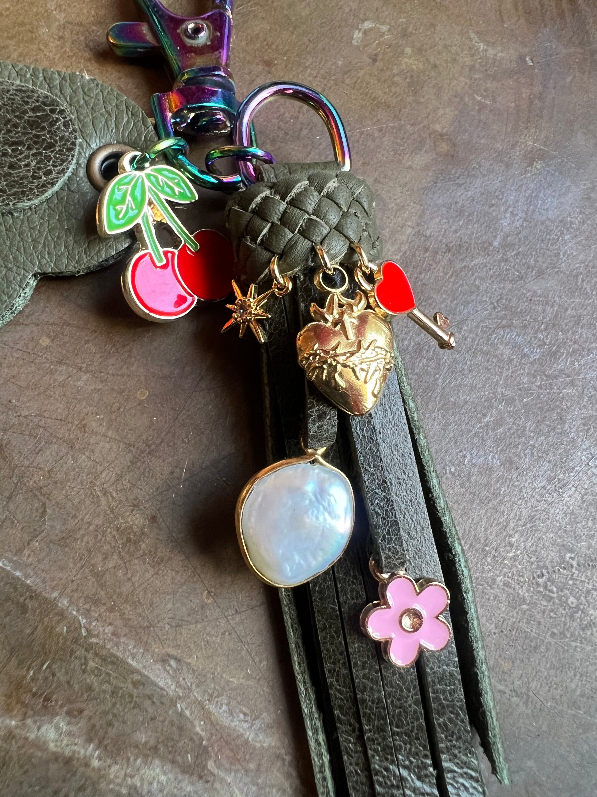 5" dark olive and army green leather on iridescent hardware, includes keyring (not pictured.)